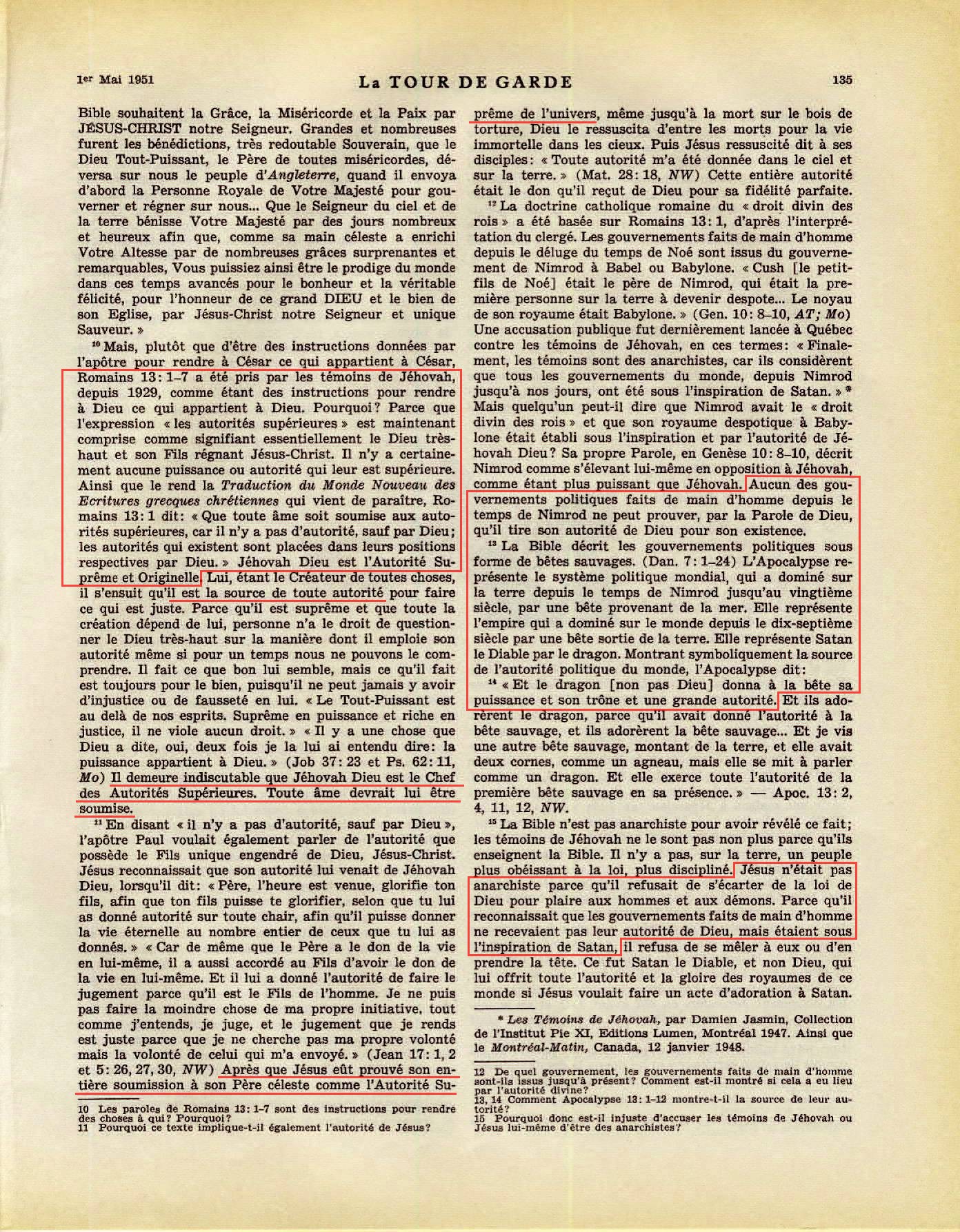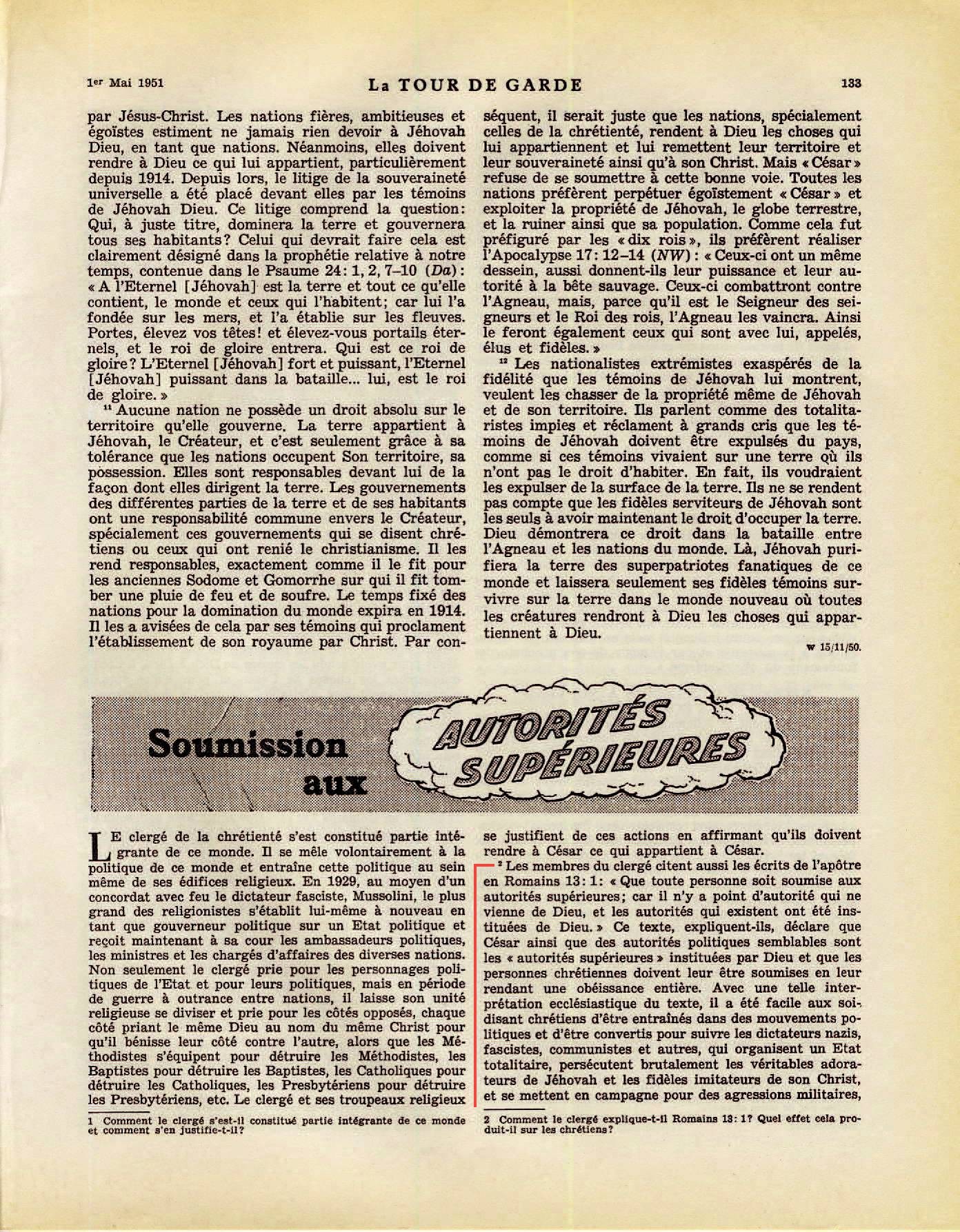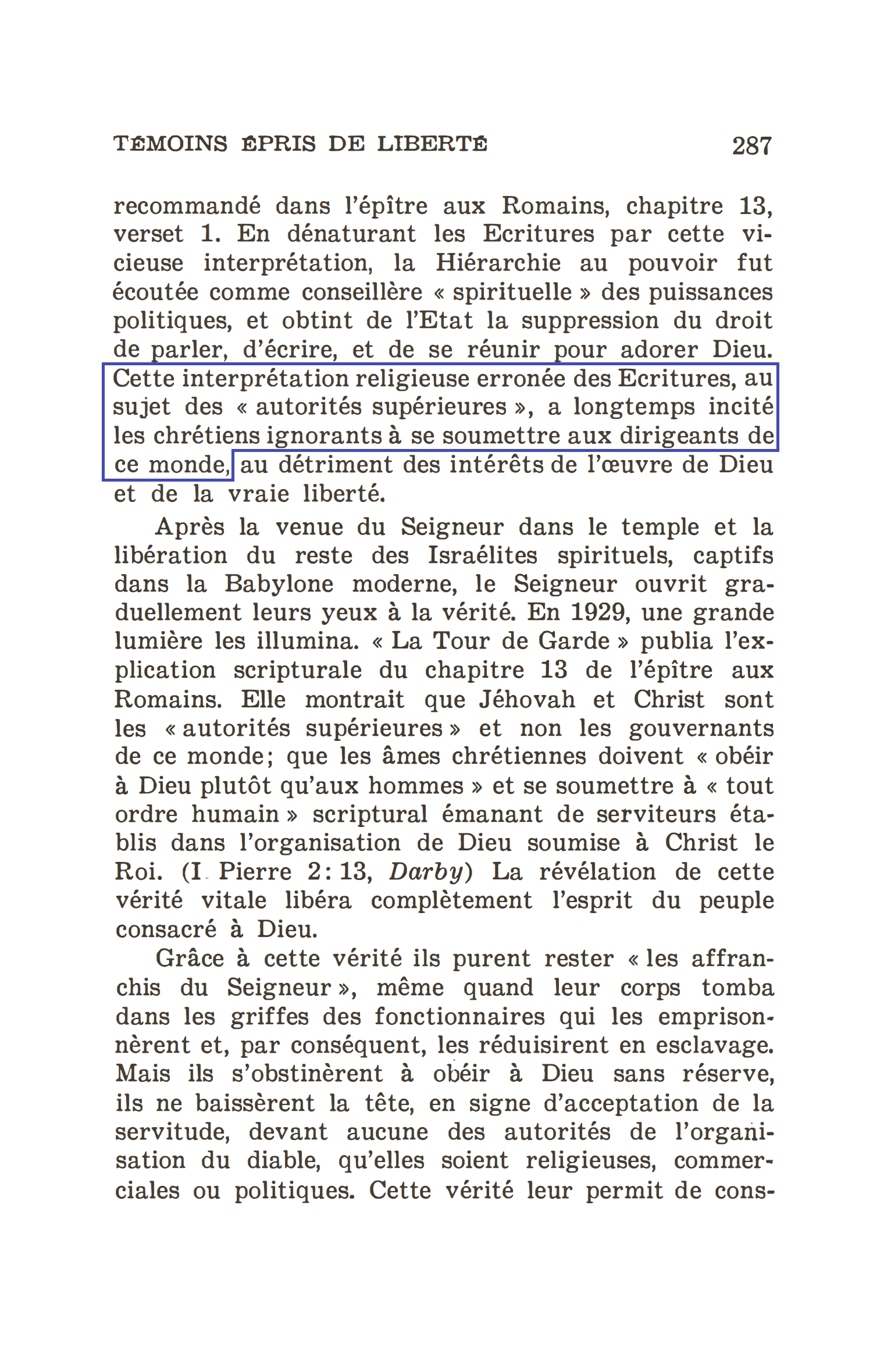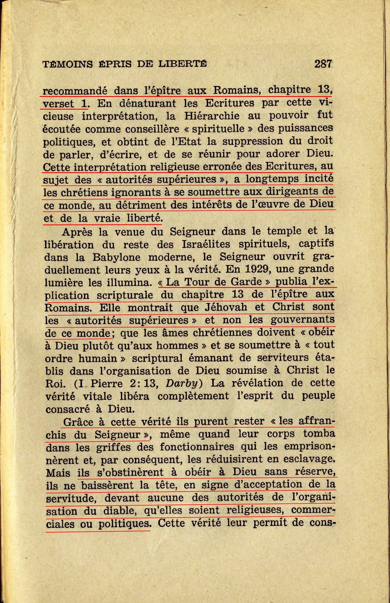 [...] à cause de la doctrine religieuse prévalant encore, selon laquelle les chefs de l'organisation visible de Satan sont les "autorités supérieures" auxquelles toutes les âmes chrétiennes doivent être soumises, comme cela est recommandé dans l'épître aux Romains, chapitre 13, verset 1 [...] Cette interprétation religieuse erronée des Ecritures, au sujet des "autorités supérieures", a longtemps incité les chrétiens ignorants à se soumettre aux dirigeant de ce monde, au détriment des intérêts de l'oeuvre de Dieu et de la vraie liberté. "La Tour de Garde" publia l'explication scripturale du chapitre 13 de l'épître aux Romains. Elle montrait que Jéhovah et Christ sont les "autorités supérieures" et non les gouvernants de ce monde "