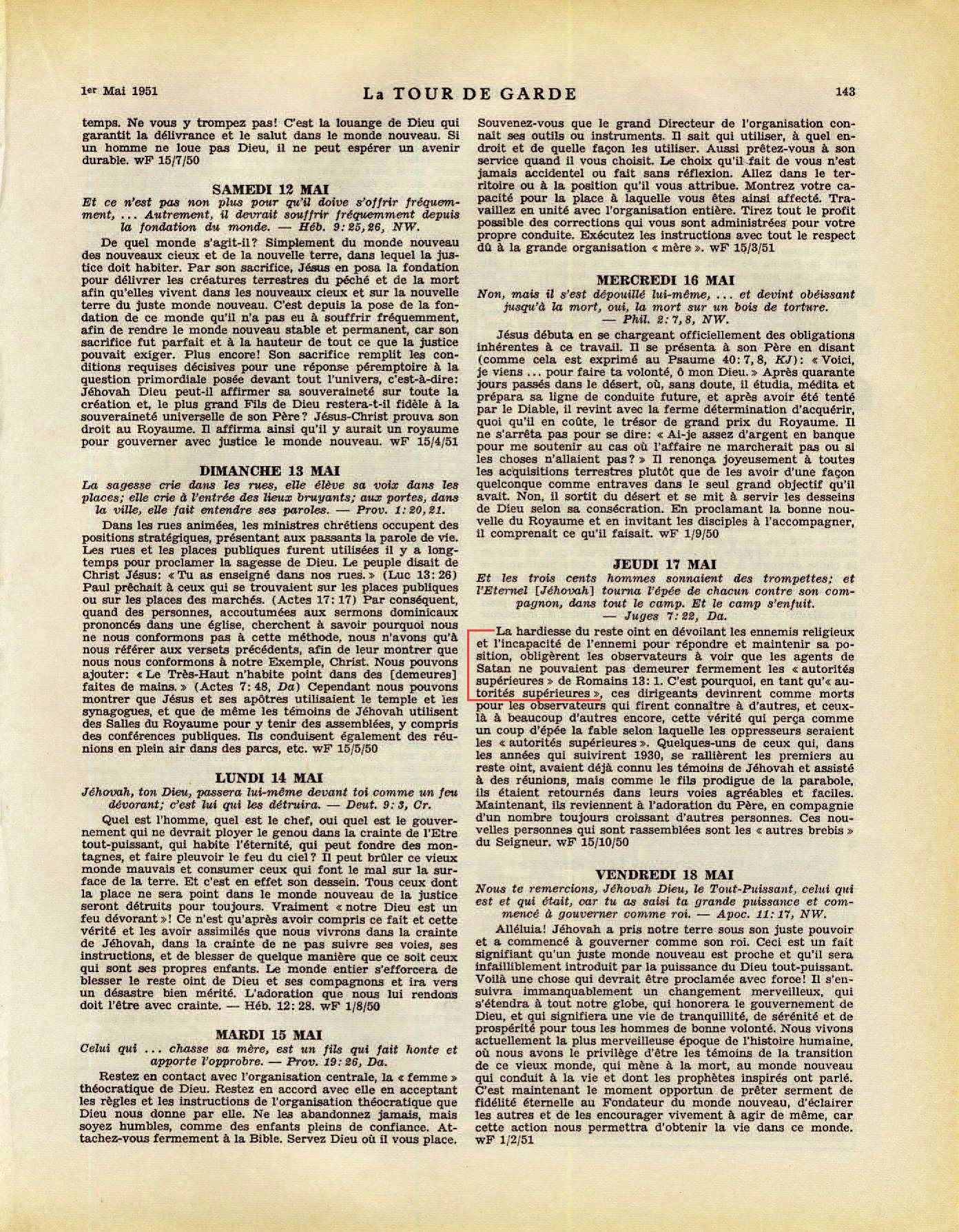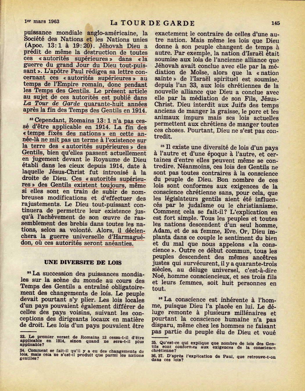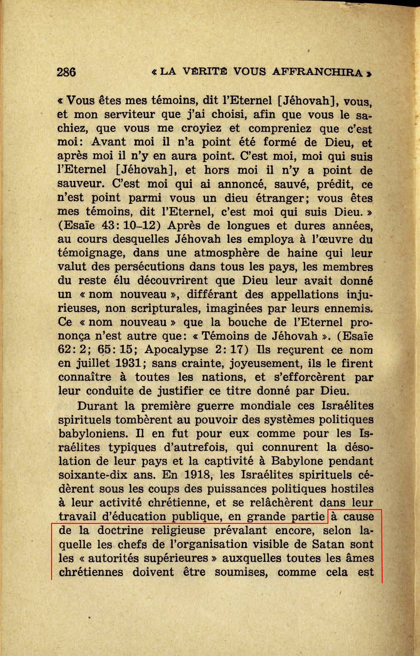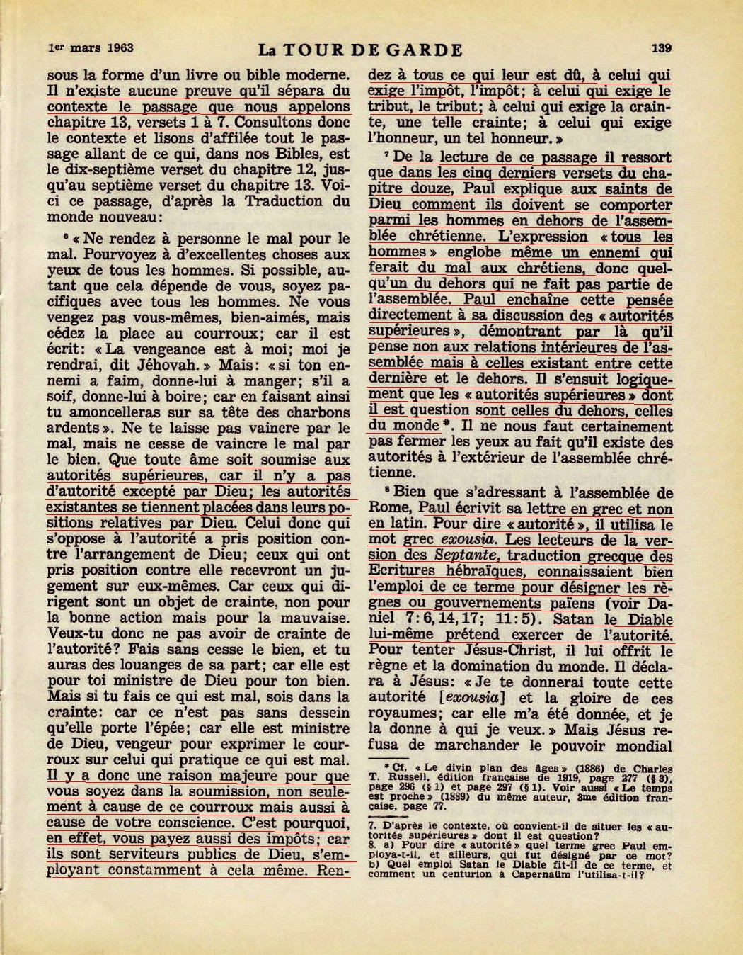 [...] à cause de la doctrine religieuse prévalant encore, selon laquelle les chefs de l'organisation visible de Satan sont les "autorités supérieures" auxquelles toutes les âmes chrétiennes doivent être soumises, comme cela est recommandé dans l'épître aux Romains, chapitre 13, verset 1 [...] Cette interprétation religieuse erronée des Ecritures, au sujet des "autorités supérieures", a longtemps incité les chrétiens ignorants à se soumettre aux dirigeant de ce monde, au détriment des intérêts de l'oeuvre de Dieu et de la vraie liberté. "La Tour de Garde" publia l'explication scripturale du chapitre 13 de l'épître aux Romains. Elle montrait que Jéhovah et Christ sont les "autorités supérieures" et non les gouvernants de ce monde "