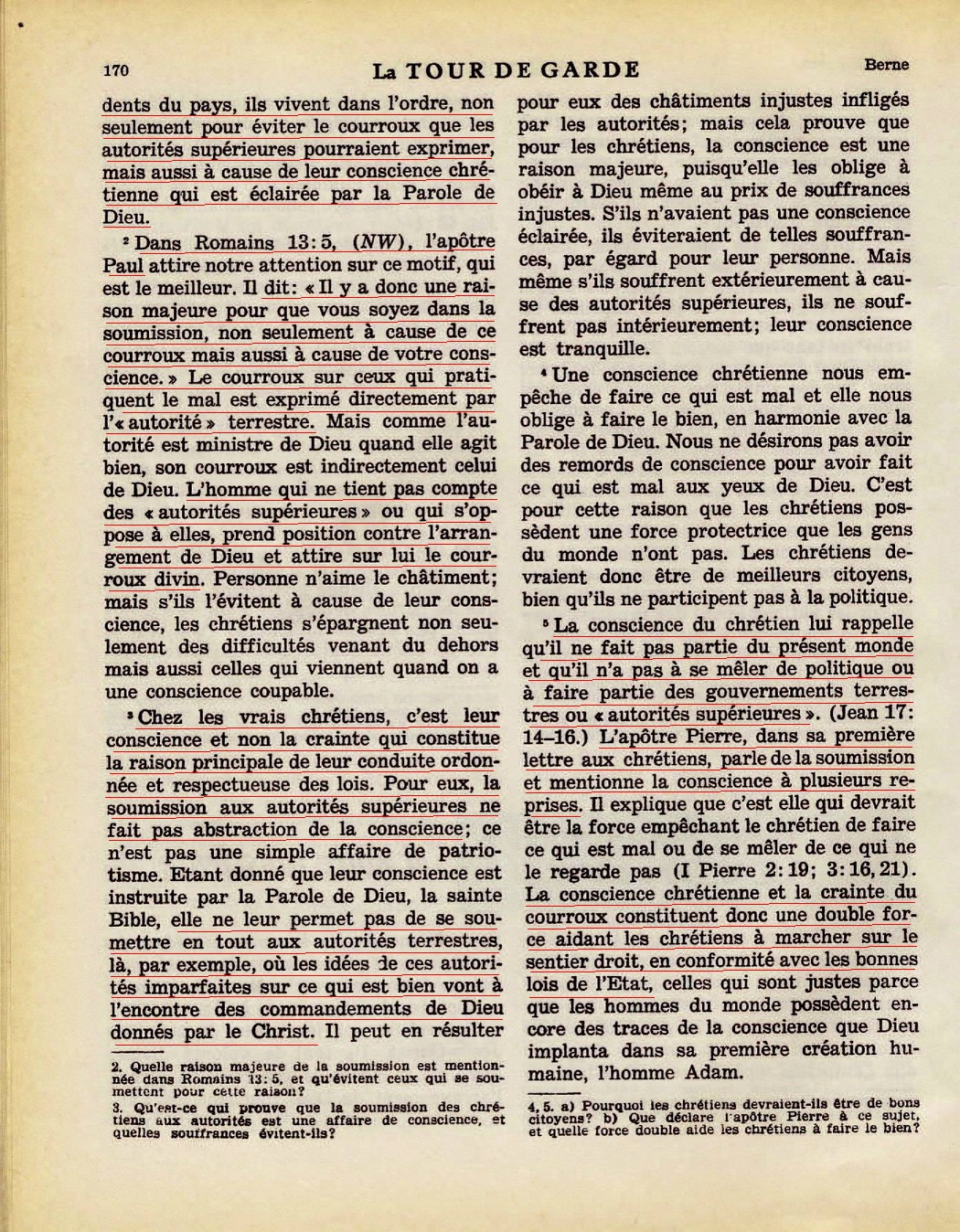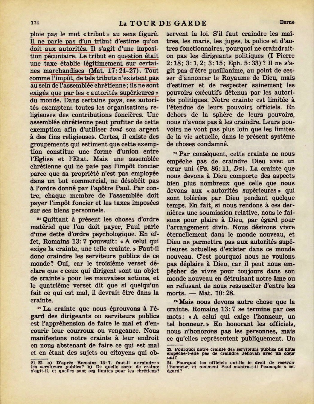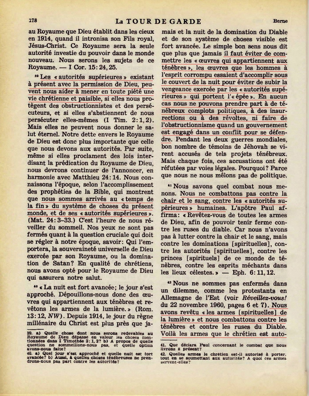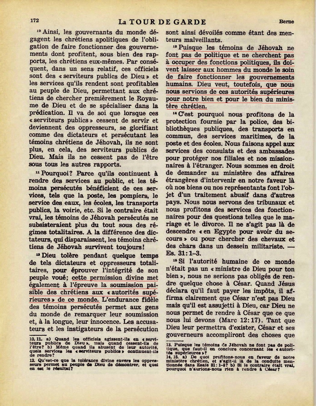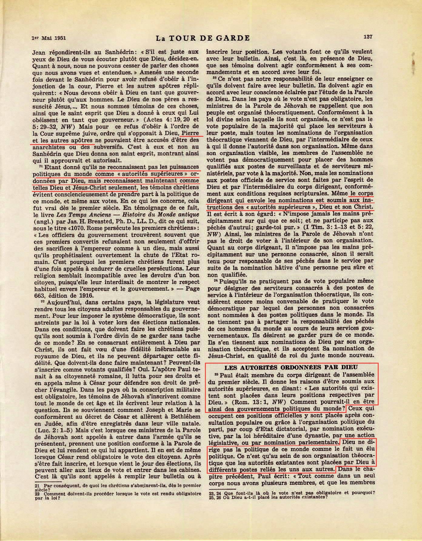 [...] à cause de la doctrine religieuse prévalant encore, selon laquelle les chefs de l'organisation visible de Satan sont les "autorités supérieures" auxquelles toutes les âmes chrétiennes doivent être soumises, comme cela est recommandé dans l'épître aux Romains, chapitre 13, verset 1 [...] Cette interprétation religieuse erronée des Ecritures, au sujet des "autorités supérieures", a longtemps incité les chrétiens ignorants à se soumettre aux dirigeant de ce monde, au détriment des intérêts de l'oeuvre de Dieu et de la vraie liberté. "La Tour de Garde" publia l'explication scripturale du chapitre 13 de l'épître aux Romains. Elle montrait que Jéhovah et Christ sont les "autorités supérieures" et non les gouvernants de ce monde "