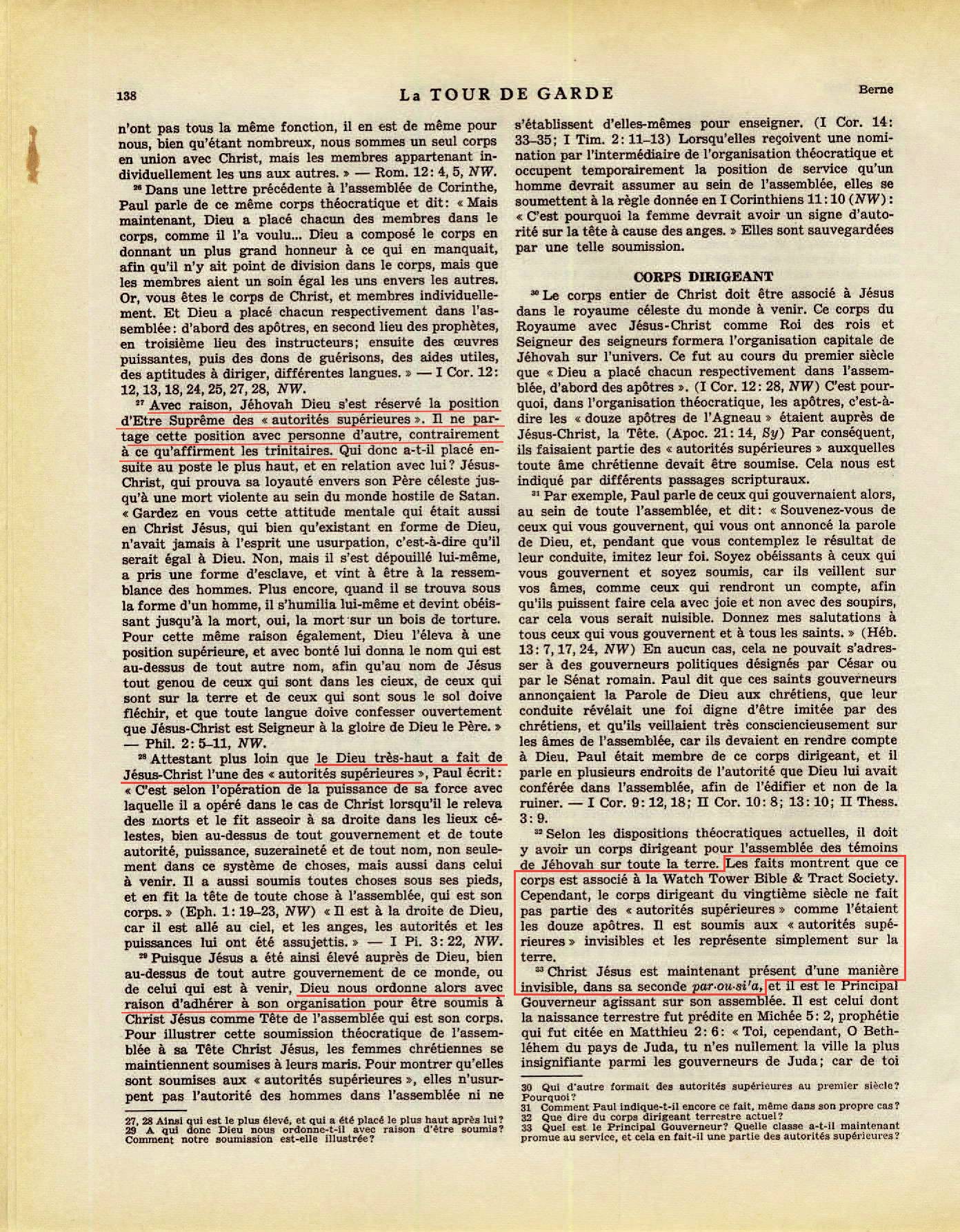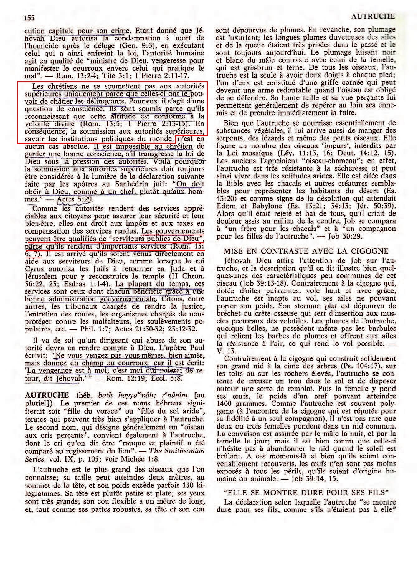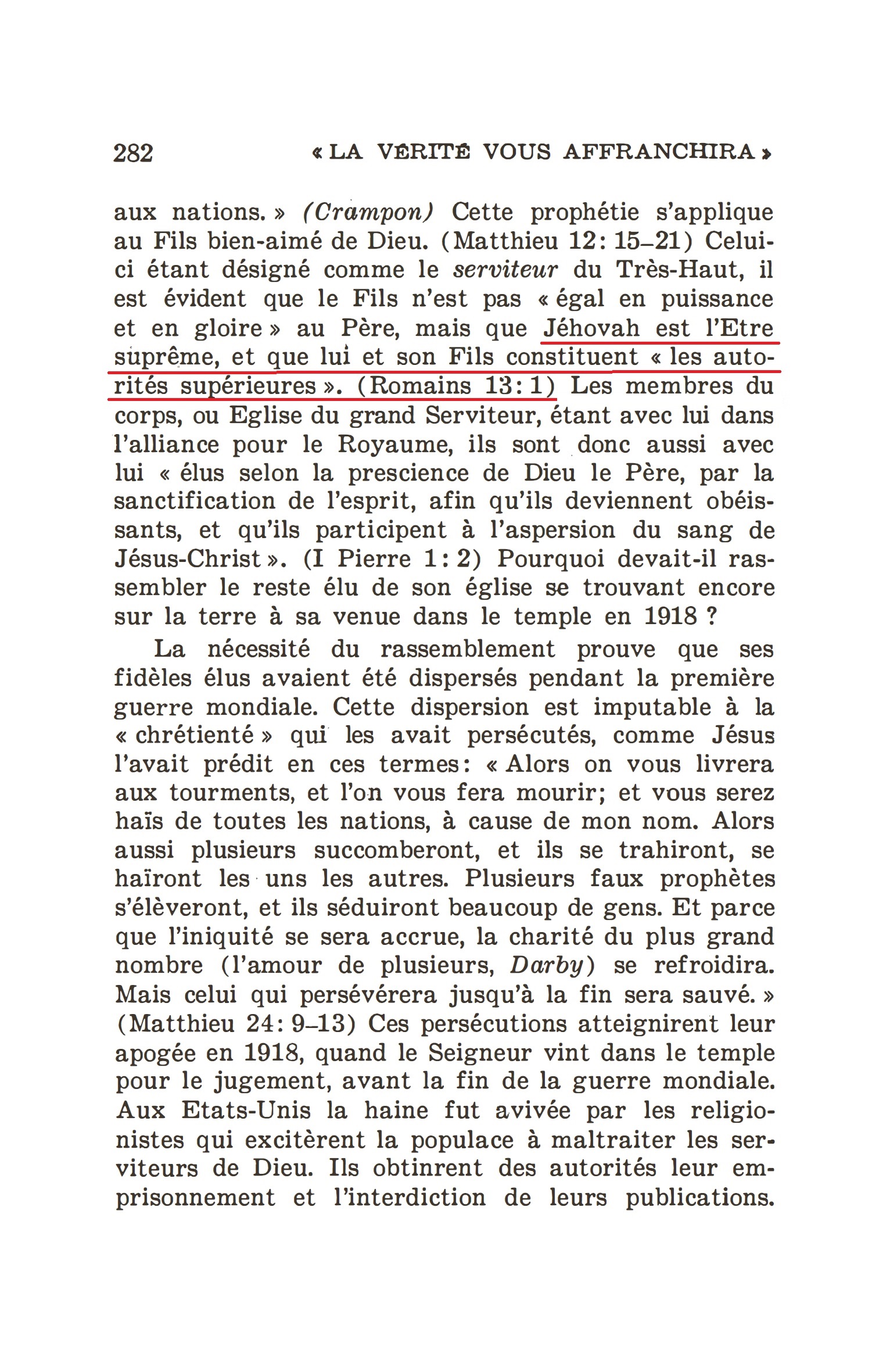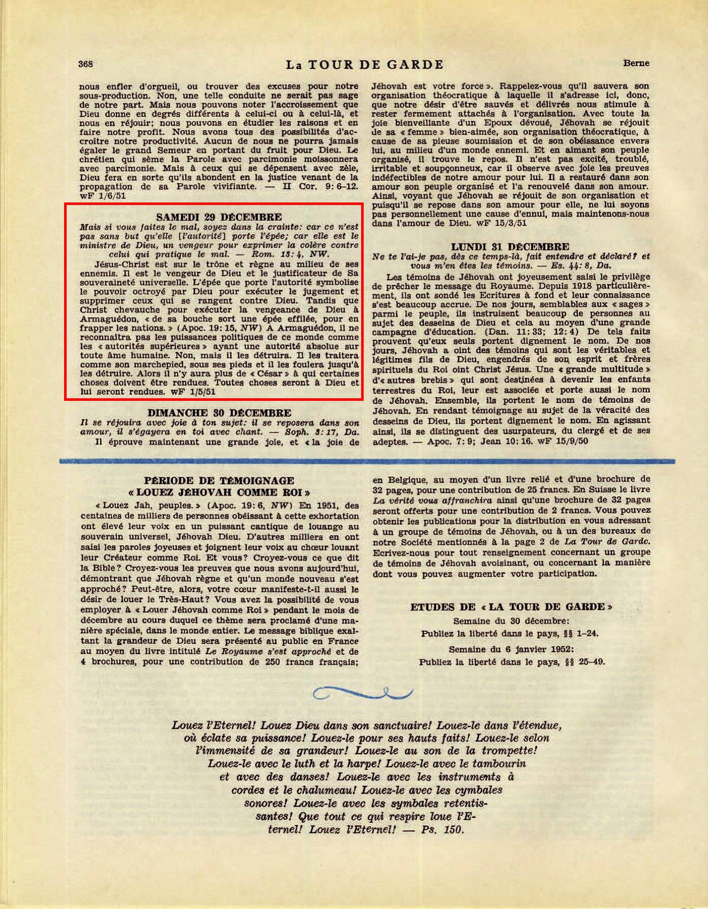 [...] à cause de la doctrine religieuse prévalant encore, selon laquelle les chefs de l'organisation visible de Satan sont les "autorités supérieures" auxquelles toutes les âmes chrétiennes doivent être soumises, comme cela est recommandé dans l'épître aux Romains, chapitre 13, verset 1 [...] Cette interprétation religieuse erronée des Ecritures, au sujet des "autorités supérieures", a longtemps incité les chrétiens ignorants à se soumettre aux dirigeant de ce monde, au détriment des intérêts de l'oeuvre de Dieu et de la vraie liberté. "La Tour de Garde" publia l'explication scripturale du chapitre 13 de l'épître aux Romains. Elle montrait que Jéhovah et Christ sont les "autorités supérieures" et non les gouvernants de ce monde "