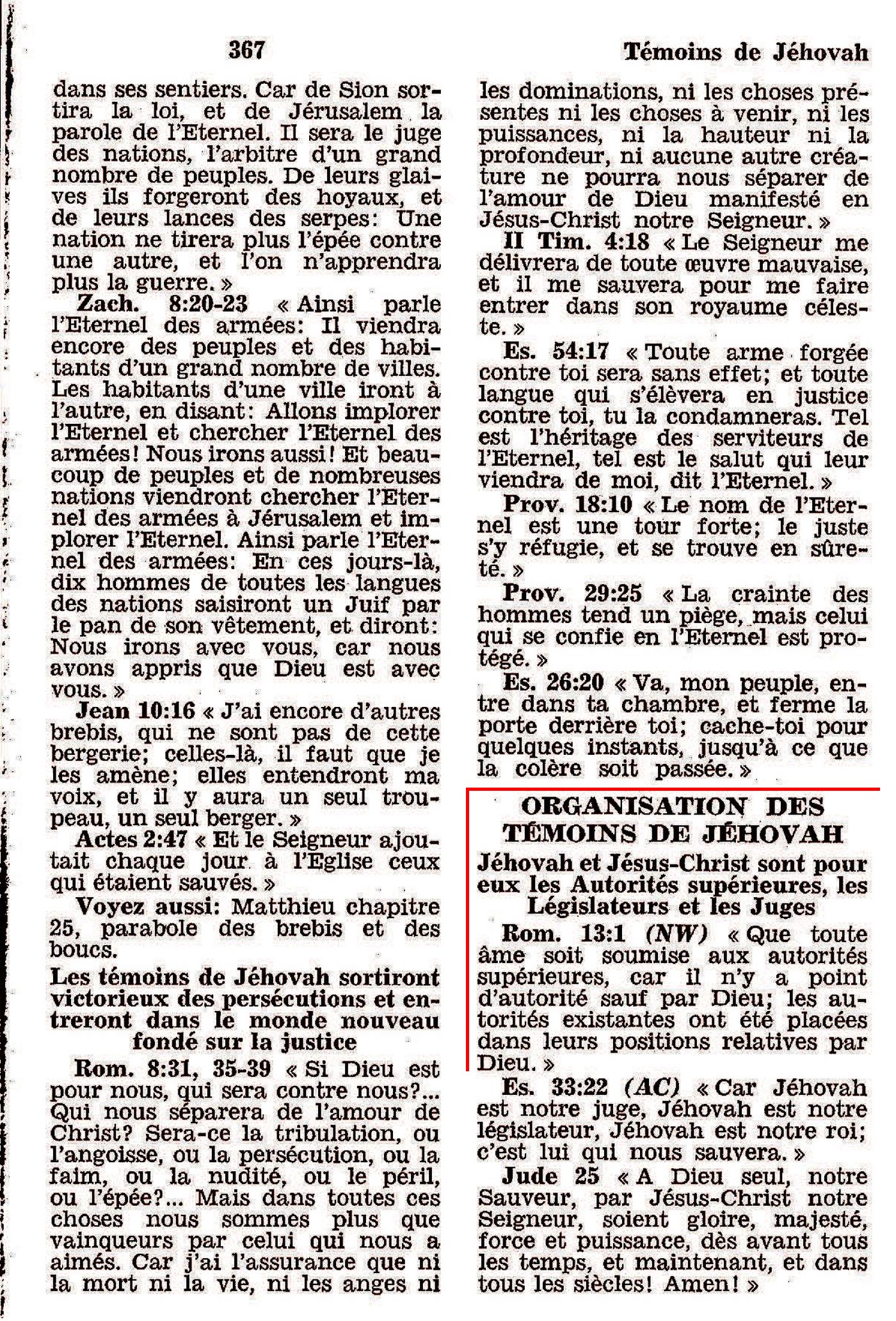 Romains 13:1-7 a été pris par les témoins de Jéhovah, depuis 1929, comme étant des instructions pour rendre à Dieu ce qui appartient à Dieu. Pourquoi ? Parce que l'expression "les autorités supérieures" est maintenant comprise comme signifiant essentiellement le Dieu très haut et son Fils Jésus-Christ. Il n'y a certainement aucune puissance ou autorité qui leur est supérieure. Ainsi que le rend la Traduction du Monde Nouveau des Ecritures grecques chrétiennes qui vient de paraître, Romains 13:1 dit : "Que toute âme soit soumise aux autorités supérieures, car il n'y a pas d'autorité, sauf par Dieu; les autorités qui existent sont placées dans leurs positions respectives par Dieu." Jéhovah Dieu est l'Autorité Suprême et Originelle... il est la source de toute autorité... Il demeure indiscutable que Jéhovah Dieu est le Chef des Autorités Supérieures. Toute âme devrait lui être soumise... Après que Jésus eût prouvé son entière soumission à son Père céleste comme l'Autorité Suprême de l'univers... Aucun des gouvernements politiques fait de main d'homme depuis le temps de Nimrod ne peut prouver, par la Parole de Dieu, qu'il tire son autorité de Dieu pour son existence. La Bible décrit les gouvernements politiques sous forme de bêtes sauvages... par une bête sortie de la terre. Elle représente Satan le Diable par le dragon. Montrant symboliquement la source de l'autorité politique du monde, l'Apocalypse dit: "Et le dragon [non pas Dieu] donna à la bête sa puissance et son trône est une grande autorité... Jésus n'était pas anarchiste parce qu'il refusait de s'écarter de la loi de Dieu pour plaire aux hommes et aux démons. Parce qu'il reconnaissait que les gouvernements faits de main d'homme ne recevaient pas leur autorité de Dieu, mais étaient sous l'inspiration de Satan.. Le clergé qui affirme avec insistance que les puissances politiques de ce monde sont les autorités supérieures auxquelles nous devons nous soumettre, invoque certains passages scripturaux pour confirmer son argument... Les citations déjà mentionnées doivent être confrontées avec l'Apocalypse, chapitre 13 et d'autres textes montrant que les puissances politiques de ce monde sont créés par le "gouverneur de ce monde", "le dieu de ce système de choses" et lui sont soumises. "Le monde entier se trouve sous la puissance du méchant."... On ne peut pas dire des autres puissances et autorités politiques de ce monde qu'elles sont des types de Christ comme étant le Principal Serviteur de Dieu, et que par conséquent Dieu donna l'autorité à de telles puissances politiques... Les puissances politiques de ce monde ne sont donc pas les "autorités supérieures" auxquelles les âmes chrétiennes doivent être soumises pour chaque chose qu'elles exigent... Pierre et les autres apôtres..ne reconnaissent pas les puissances politiques du monde comme "autorités supérieures" ordonnées par Dieu, mais reconnaissent maintenant comme telles Dieu et Jésus-Christ seulement... le corps dirigeant qui envoie les nominations est soumis aux instructions des "autorités supérieures", Dieu et son Christ... Paul était membre du corps dirigeant de l'assemblée du premier siècle. Il donne les raisons d'être soumis aux autorités supérieures, en disant: "Les autorités qui existent sont placées dans leurs positions respectives par Dieu." (Rom. 13:1, NW) Comment pourrait-il en être ainsi des gouvernements politiques du monde ?... Dieu ne dirige pas la politique de ce monde comme le fait un élu politique. Ce n'est qu'au sein de son organisation théocratique que les autorités existantes sont placées par Dieu à différents postes reliés les uns aux autres... Avec raison, Jéhovah Dieu s'est réservé la position d'Etre Suprême des "autorités supérieures". Il ne partage cette position avec personne d'autre, contrairement à ce qu'affirment les trinitaires... le Dieu très-haut a fait de Jésus-Christ l'une des "autorités supérieures"... Dieu nous ordonne alors avec raison d'adhérer à son organisation... Les faits montrent que ce corps est associé à la Watch Tower Bible & Tract Society. Cependant, le corps dirigeant du vingtième siècle ne fait pas partie des "autorités supérieures" comme l'étaient les douze apôtres. Il est soumis aux "autorités supérieures" invisibles et les représente simplement sur la terre. Christ Jésus est maintenant présent d'une manière invisible, dans sa seconde par.ou-si'a... En cette qualité de Gouverneur ayant une autorité supérieure, Jésus dans sa seconde par.ou-si'a désigne la classe ointe de ses esclaves... cela ne signifie pas que la classe de "l'esclave fidèle et prudent" fait partie des "autorités supérieures" pour manier l'épée de l'exécution. Puisque la nomination de cette classe fidèle est théocratique, elle doit être respectée et ses services doivent être reçus joyeusement, comme venant des "autorités supérieures"... (Rom. 13:2, NW) Jéhovah Dieu a édifié une organisation universelle composée de ses créatures fidèles célestes et terrestres, et il en désigne certaines à des positions comportant une autorité spéciale... C'est pour notre bien que nous nous soumettons aux "autorités supérieures" et à la façon dont Dieu les dispose. Continue à faire le bien et tu recevras des éloges de l'autorité, car elle est le ministre de Dieu pour toi, pour ton bien. (Rom. 13:3,4, NW) Cela ne peut s'appliquer aux gouverneurs de ce monde qui ferment les yeux sur les malfaiteurs, louent et font l'éloge de ceux qui pratiquent la méchanceté dans ce système de choses. les gouverneurs du monde terrorisent et inspirent la crainte à ceux qui désirent accomplir de bonnes actions... Et ceux qui, dans l'organisation théocratique, représentent "les autorités supérieures" dans l'exercice de leurs fonctions donneront des éloges également à ceux qui font le bien en les encourageant... A Armaguédon, il ne rec