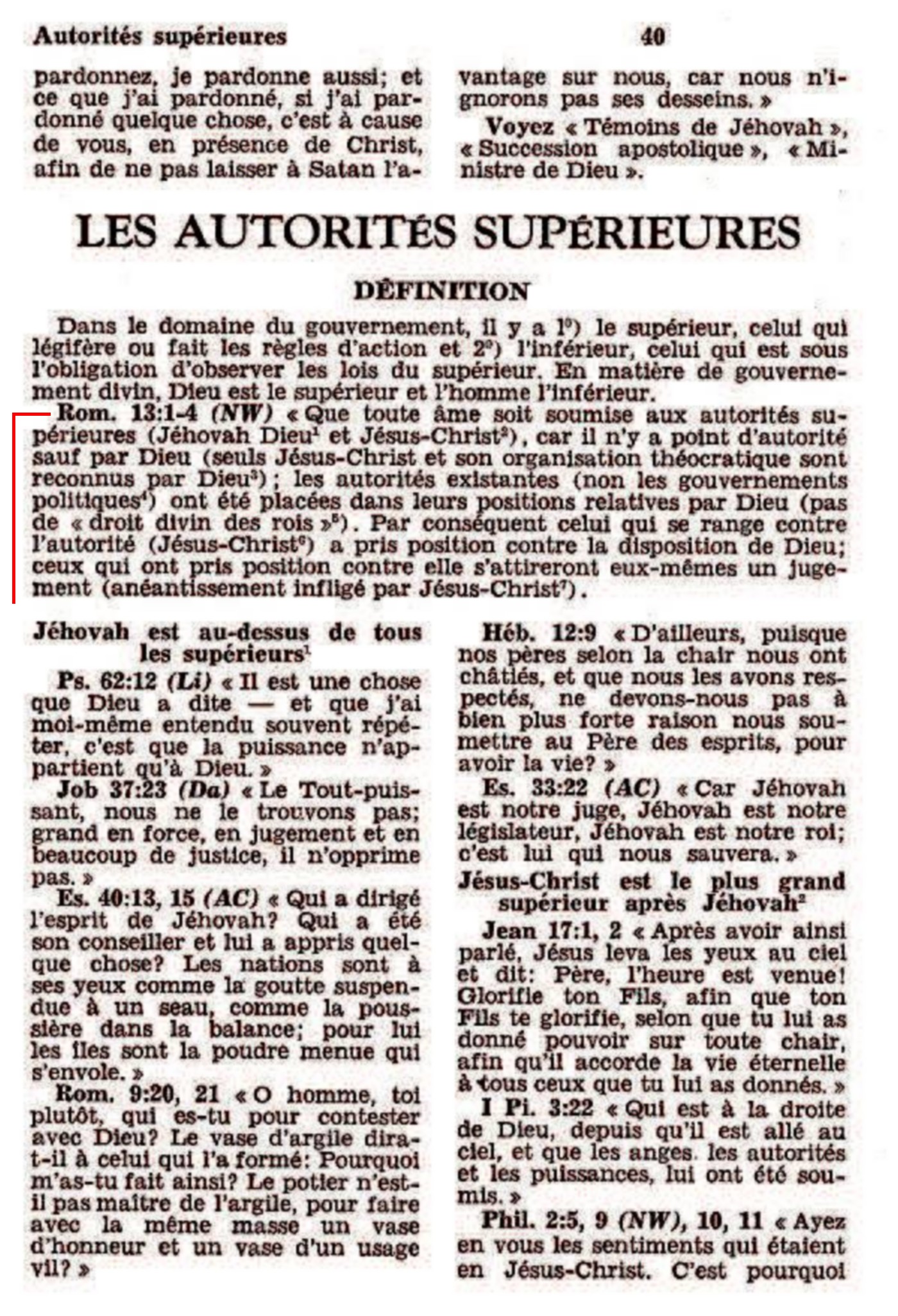 Rom. 13:1-4 (NW) " Que toute âme soit soumise aux autorités supérieures (Jéhovah Dieu et Jésus-Christ), car il n'y a point d'autorité sauf par Dieu (seuls Jésus-Christ et son organisation théocratique sont reconnus par Dieu); les autorités existantes (non les gouvernements politiques) ont été placées dans leurs positions respectives par Dieu (pas de "droit divin des rois"). Par conséquent celui qui se range contre l'autorité (Jésus-Christ) a pris position contre la disposition de Dieu; ceux qui ont pris position contre elle s'attireront eux-mêmes un jugement (anéantissement infligé par Jésus-Christ).
