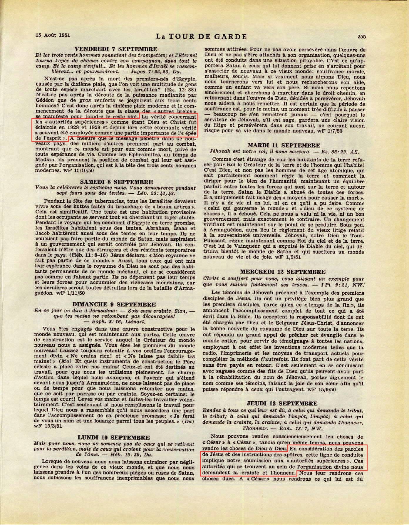 ... En considération des paroles de Jésus et des instructions des apôtres, cette ligne de conduite implique notre soumission aux "autorités supérieures". Ces autorités qui se trouvent au sein de l'organisation divine nous demandent la crainte et l'honneur. Source : 🇫🇷 La Tour de Garde, 15 Août 1951, page 255 + Cover |