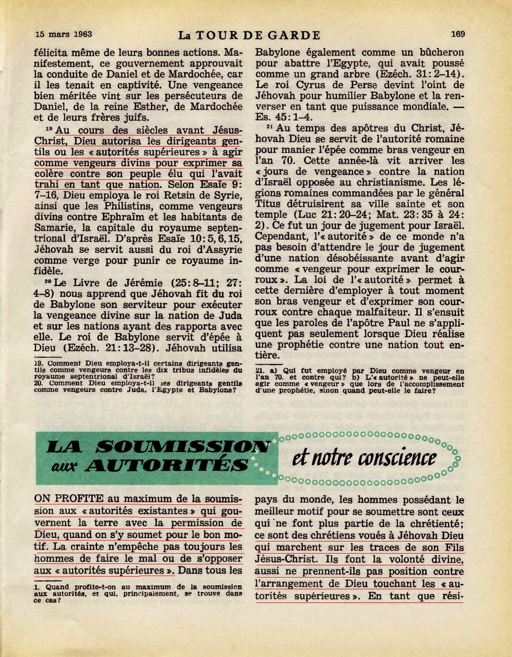 ... Le passage concernant les "autorités supérieures", "autorités en charge" (Jé) ou "autorités qui sont au-dessus" (Da) et qui se trouve à Romains 13:1, ne se réfère pas aux dirigeants des nations du monde mais au règne divin au sein de et au-dessus de l'assemblée chrétienne. Comment pouvons-nous en être sûrs ? En regardant le contexte. Celui-ci démontre que les autorités en question sont nommées par Dieu et, de toute évidence, les gouvernements corrompus et dictatoriaux de ce monde, qu'ils soient du bloc oriental ou occidental, n'ont pas été mis en place par Dieu. Ils ne sont pas des ministres ou serviteurs publics de Dieu devant décourager le mal et favoriser le bien. Mais même si l'on applique les paroles de Paul aux "bons" gouvernements humains, en cas de conflit le principe apostolique serait toujours vrai qui dit: "Il faut obéir à Dieu plutôt qu'aux hommes." - Actes 5:29. " Source : 🇫🇷 Reveillez-vous, 8 Septembre 1959, page 12 + Cover |