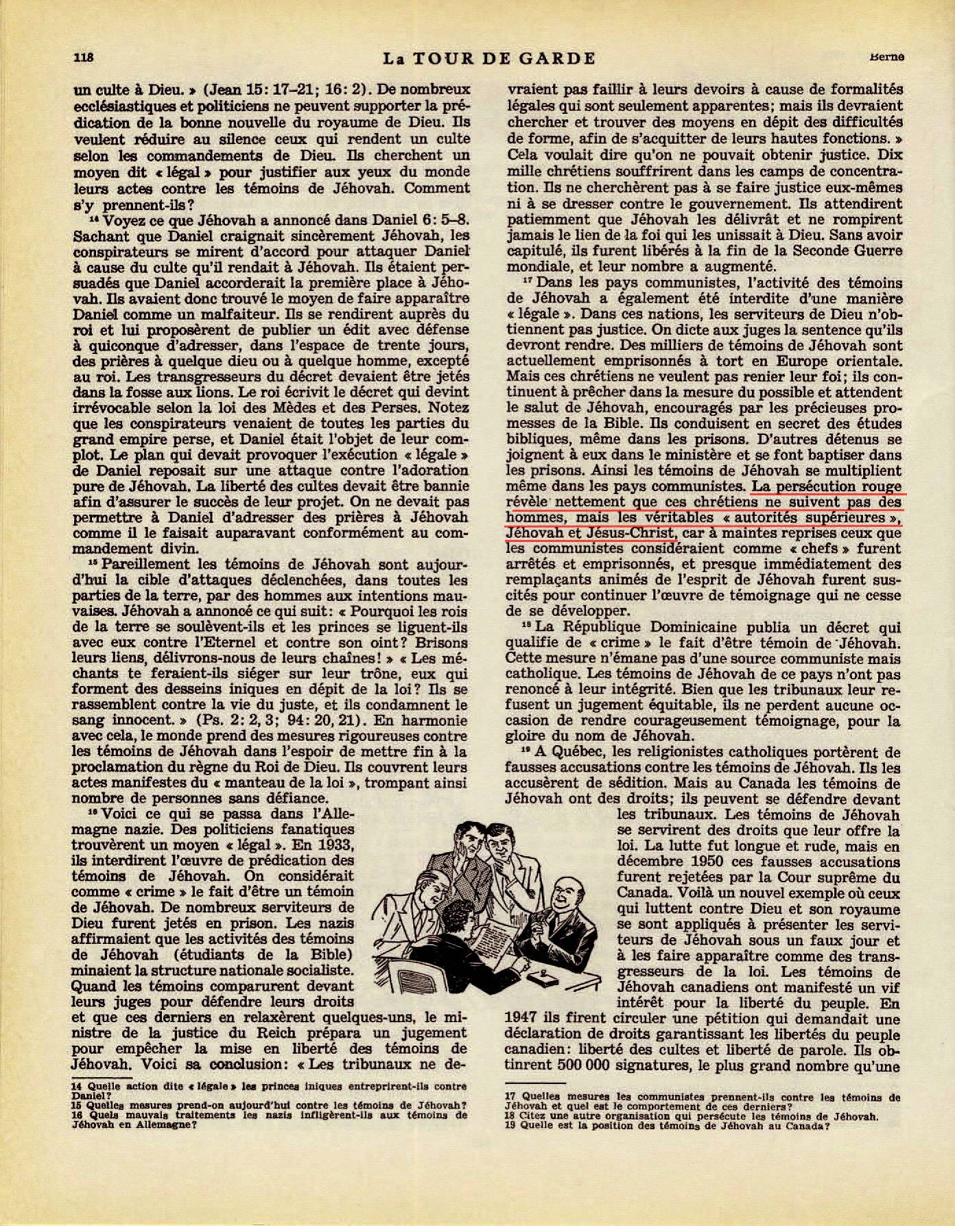 ... En considération des paroles de Jésus et des instructions des apôtres, cette ligne de conduite implique notre soumission aux "autorités supérieures". Ces autorités qui se trouvent au sein de l'organisation divine nous demandent la crainte et l'honneur. Source : 🇫🇷 La Tour de Garde, 15 Août 1951, page 255 + Cover . . . . . . . . 🇺🇸 The Watchtower, June 15, 1950, page 182 |
