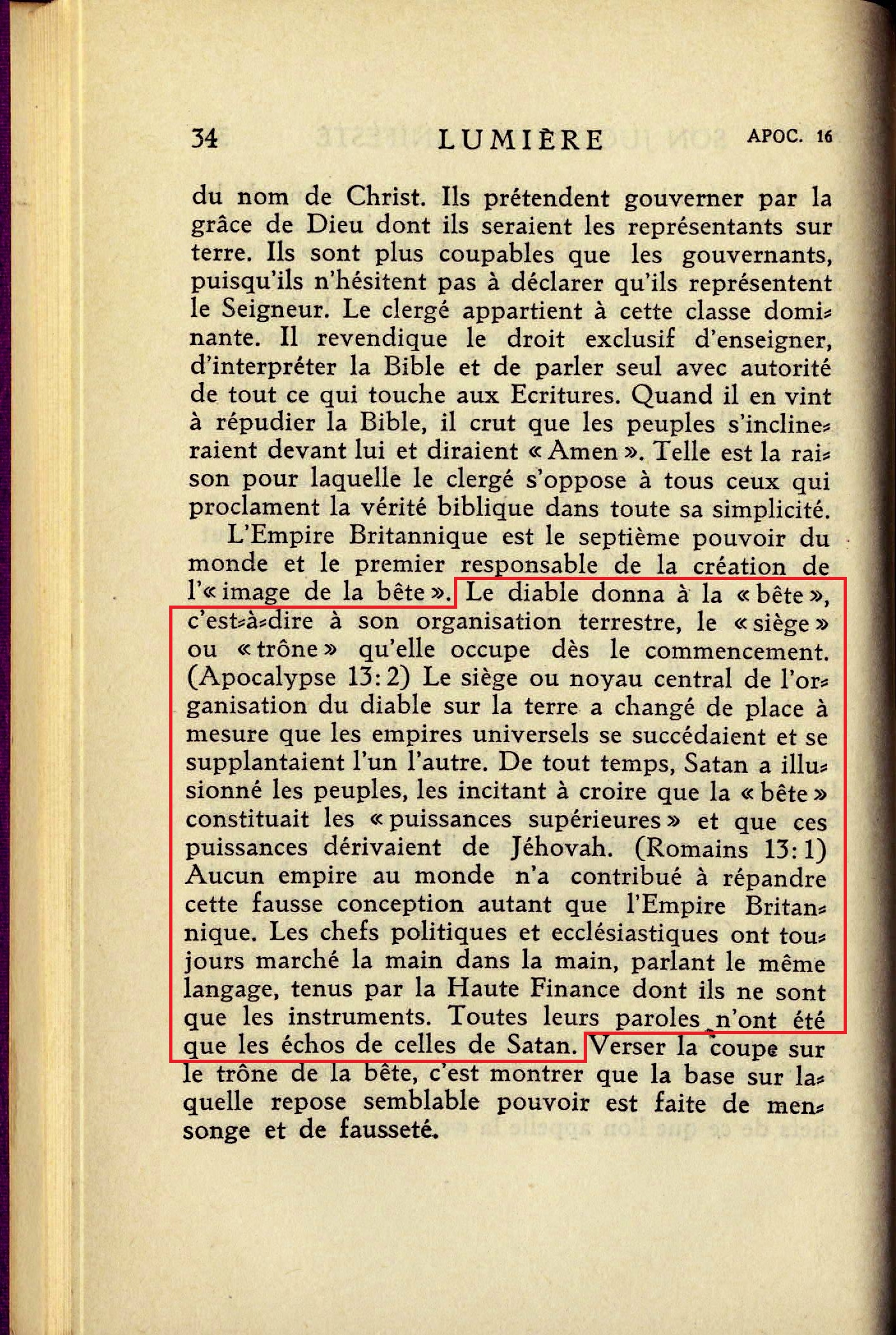 Aucun empire au monde n'a contribué à répandre cette fausse conception autant que l'Empire Britannique. Les chefs politiques et ecclésiastiques ont toujours marché main dans la main, parlant le même langage, tenus par la Haute Finance dont ils ne sont que les instruments. Toutes leurs paroles n'ont été que les échos de celles de Satan. Source : 🇫🇷 1930 - Lumière, Tome 2, page 34 + Cover |