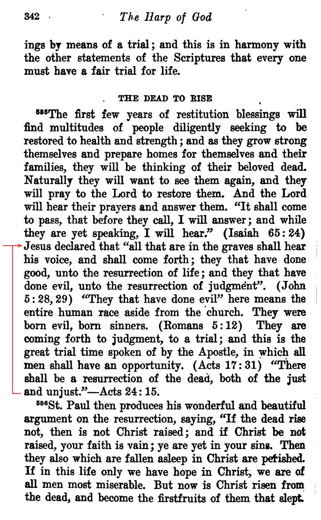 Jesus declared that "all that are in the graves shall hear his voice, and shall come forth; they that have done good, unto the resurrection of life; and they that have done evil, unto the resurrection of judgment". (John 5:28, 29) "They that have done evil" here means the entire human race aside from the church. They were born evil, born sinners. (Roman 5:12) They are coming forth to judgment, to a trial; and this is the great trial time spoken of by the de Apostle, in which all men shall have an opportunity. (Acts 17:31) "There shall be a resurrection of the dead, both of the just and injuste."-Acts 24:15.