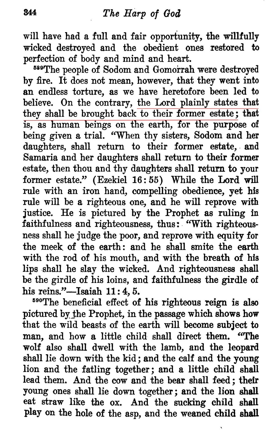 Sodom, Samaria and Jerusalem were the captives of the Devil's organization, and all went down into death as such captives. The Almighty God will destroy Satan's organization and will bring the people of those nations, with exceptions, back from that captivity [...] The return of all must take place at the same time, according to the Scriptures. Today all the Sodomites are the dead captives of Satan. Likewise the unfaithful Isrealites are the dead captives of Satan. All these captives must be brought back or returned "in the latter days". (Jer. 49:39) This can take place after Satan's organization is destroyed and Satan is bound [...] Satan dragged them down into destruction and brought them into captivity, and the returning of them from captivity will mean their return unto a condition of conscious existence, freed from Satan's organization, which will then have been destroyed [...] The heathen, such as Sodom, must return, if at all, in order to learn that the name of God has been vindicated. All then must have and will have opportunity to know and obey God's law.