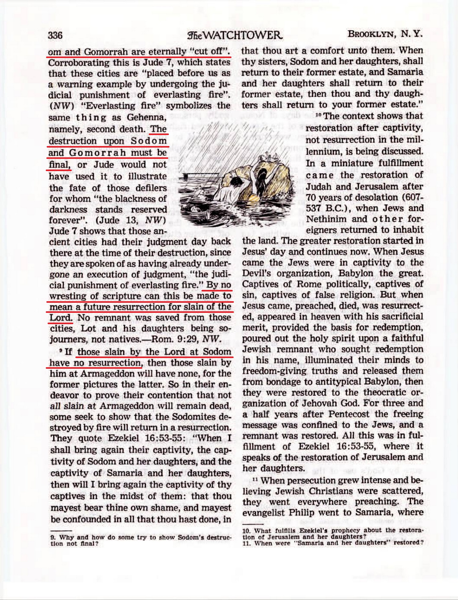 The fate of all the people who failed to flee Sodom was alike, whether it was men, women or children. They paid the penalty of everlasting destruction, because it was a judgment day. Sodom and Gomorrah, says the Bible writer Jude, “are placed before us as a warning example by undergoing the judicial punishment of everlasting fire.” — Jude 7, NW. [...] In Lot’s time some of Sodom’s citizens thought that their judgment day was just a joke. They had a good laugh but it was cut short by their everlasting destruction. Source : 🇺🇸 The Watchtower, April 1, 1955, page 199, page 200 + Cover |