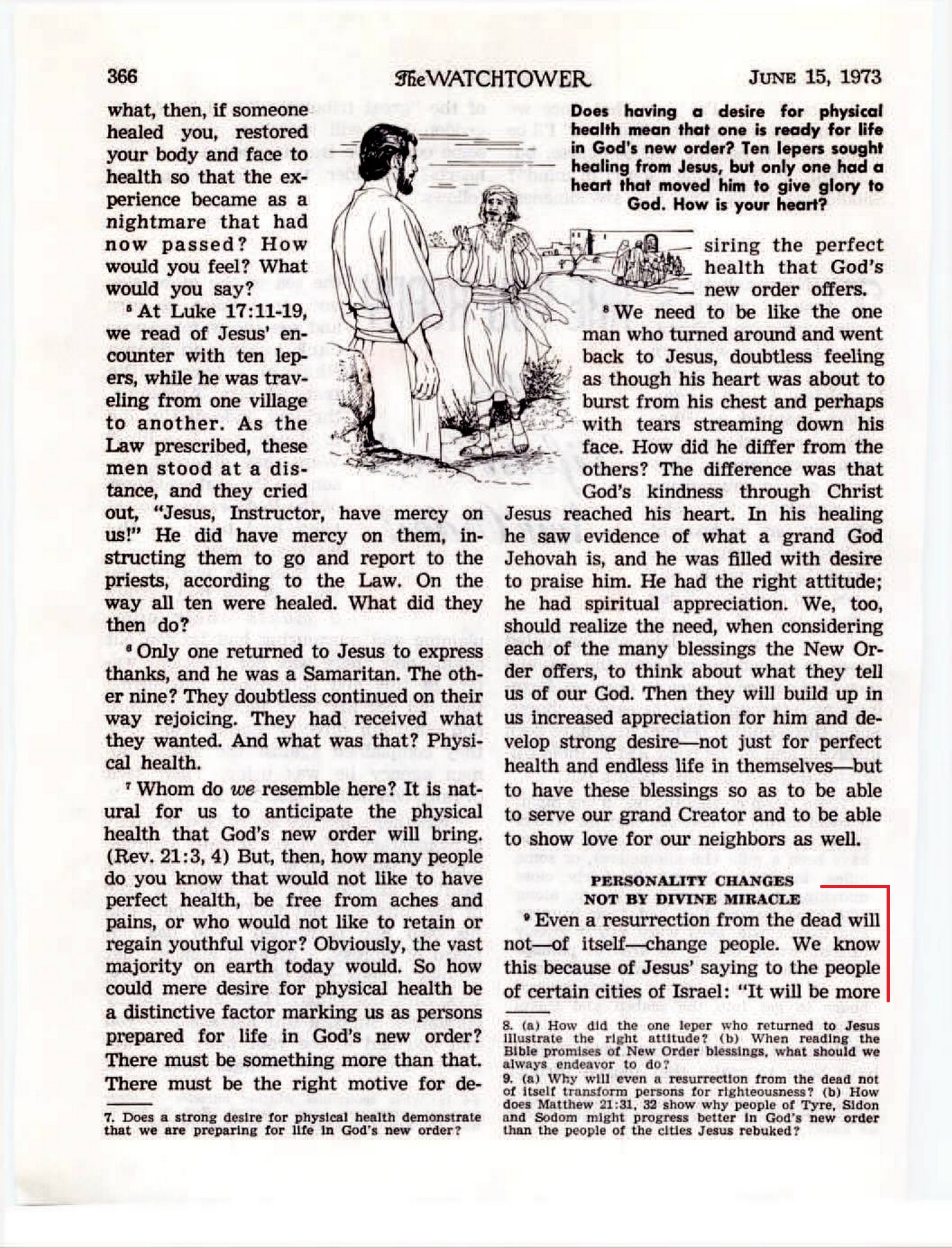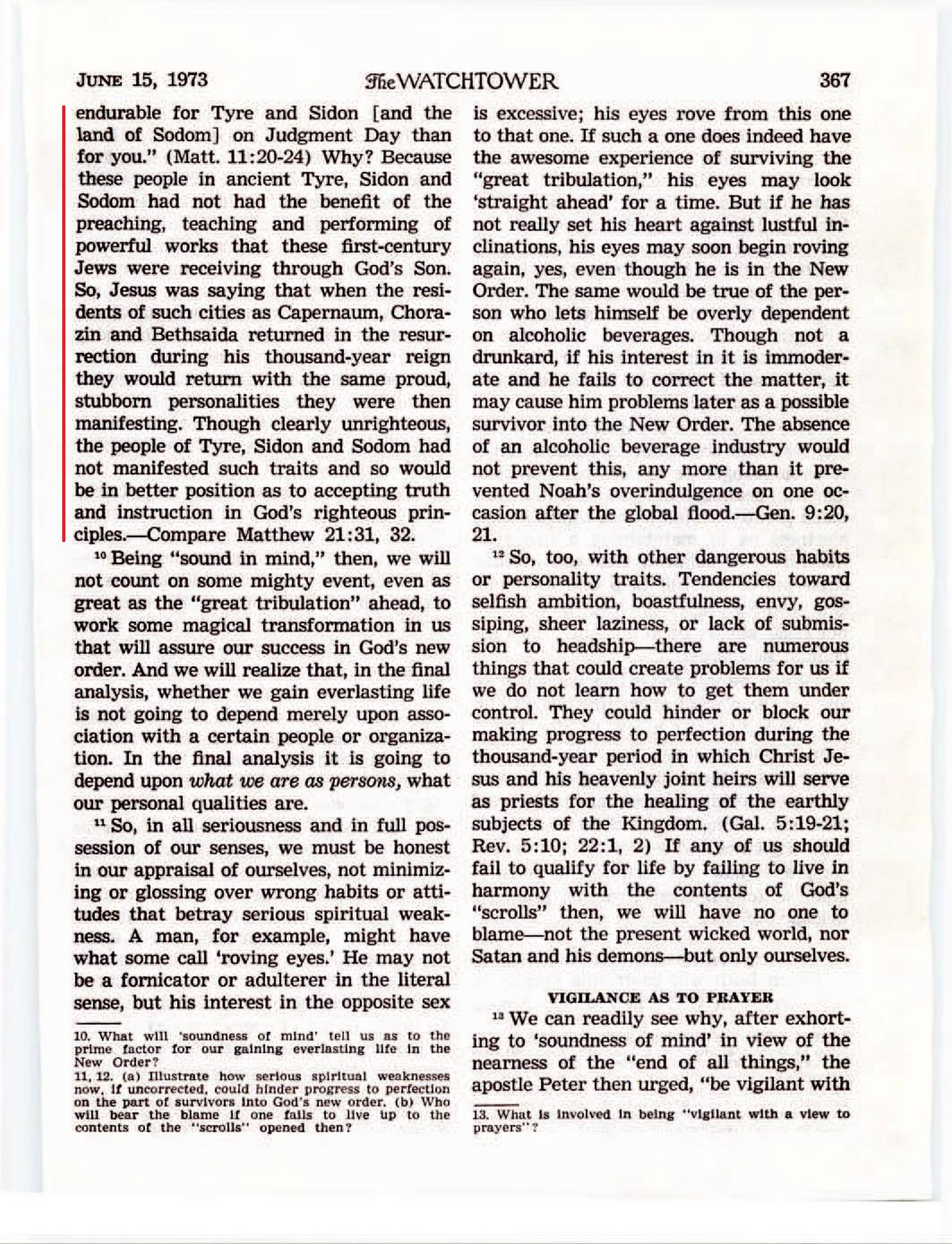 Even a resurrection from the dead will not—of itself—change people. We know this because of Jesus’ saying to the people of certain cities of Israel: “It will be more endurable for Tyre and Sidon [and the land of Sodom] on Judgment Day than for you.” (Matt. 11:20-24) Why? Because these people in ancient Tyre, Sidon and Sodom had not had the benefit of the preaching, teaching and performing of powerful works that these first-century Jews were receiving through God’s Son. So, Jesus was saying that when the residents of such cities as Capernaum, Chorazin and Bethsaida returned in the resurrection during his thousand-year reign they would return with the same proud, stubborn personalities they were then manifesting. Though clearly unrighteous, the people of Tyre, Sidon and Sodom had not manifested such traits and so would be in better position as to accepting truth and instruction in God’s righteous principles. — Compare Matthew 21:31, 32. Source : 🇺🇸 The Watchtower, June 15 1973, page 366, page 367 + Cover |