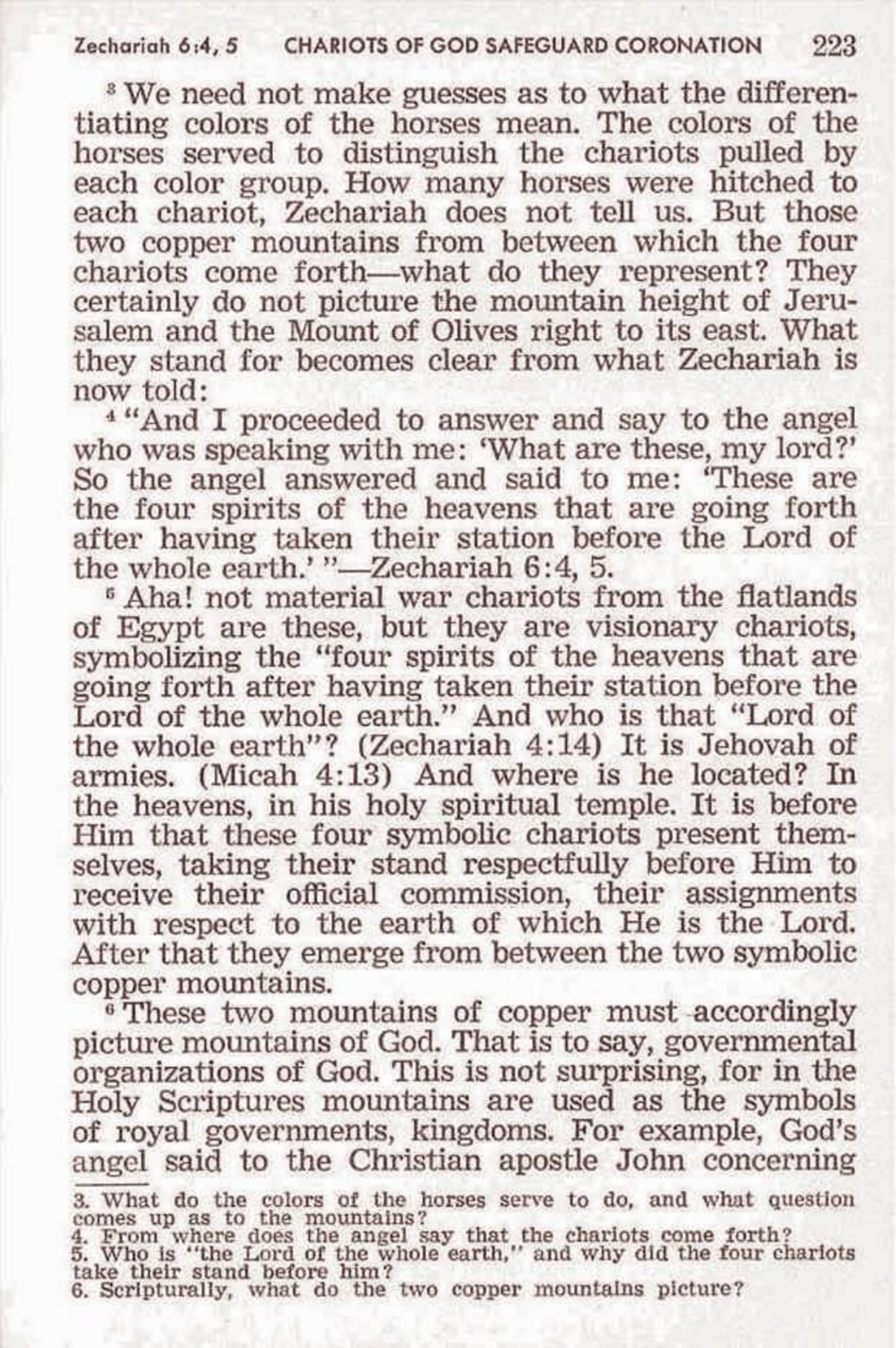 We need not make guesses as to what the differentiating colors of the horses mean. The colors of the horses served to distinguish the chariots pulled by each color group. How many horses were hitched to each chariot, Zechariah does not tell us. Source : 🇺🇸 1972 - Paradise restored to mankind by theocracy, page 222, page 223 + Cover |