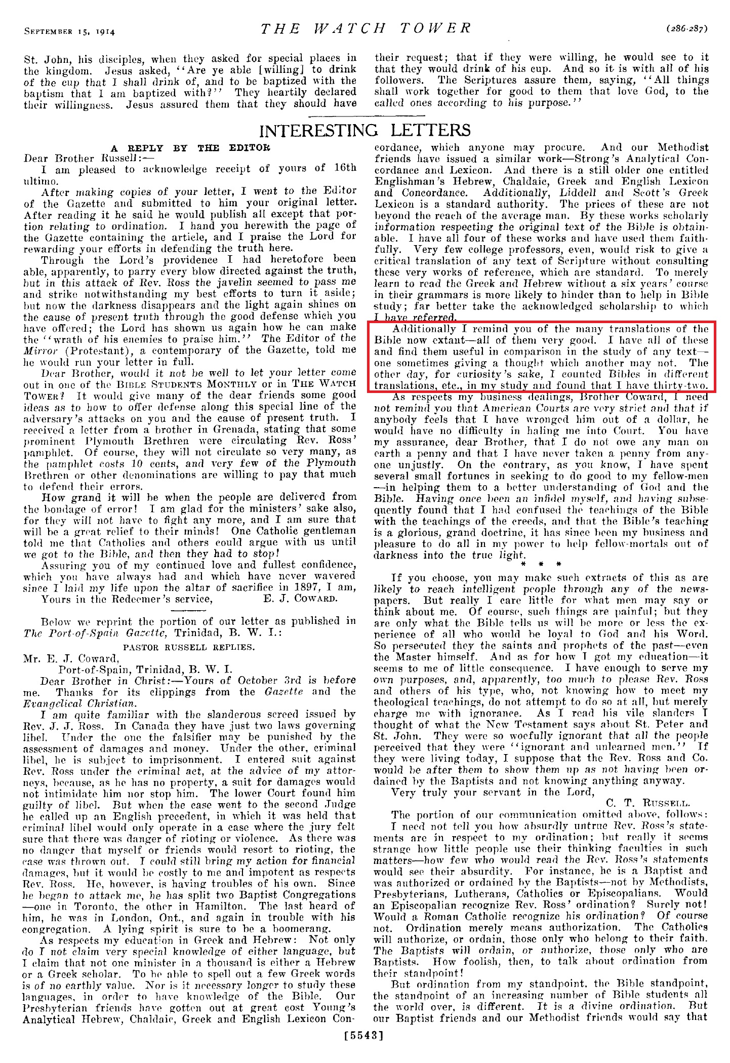 Source : 🇺🇸 The Watchtower, September 15 1914, page 286 |
