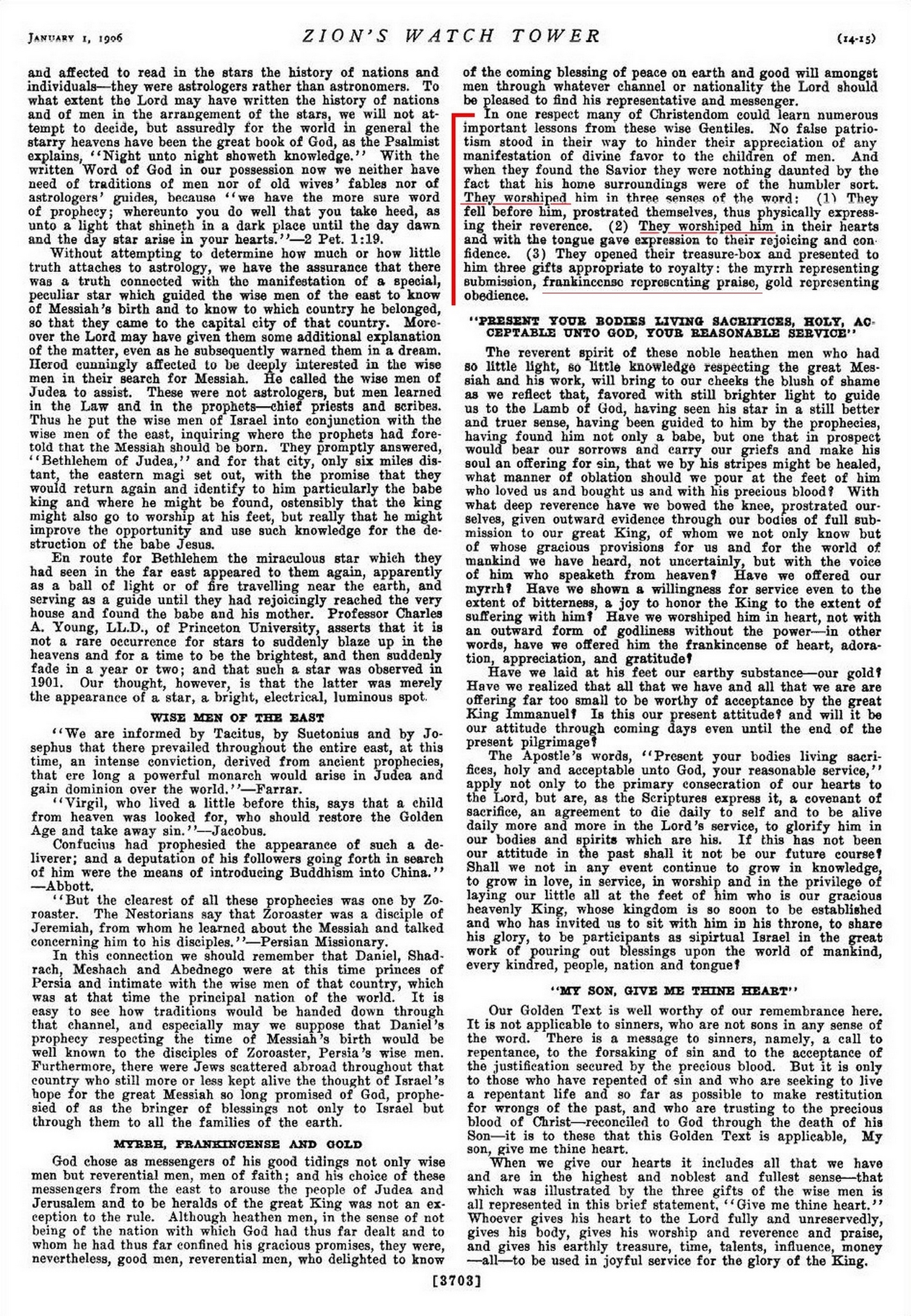 In one respect many of Christendom could learn numerous important lessons from these wise Gentiles... They worshiped him in three senses of the word: (1) They fell before him, prostrated themselves, thus physically expressing their reverence. (2) They worshiped him in their hearts and with the tongue gave expression to their rejoicing and confidence. (3) They opened their treasure-box and presented to him three gifts appropriate to royalty: the myrrh representing submission, frankincense representing praise, gold representing obedience.