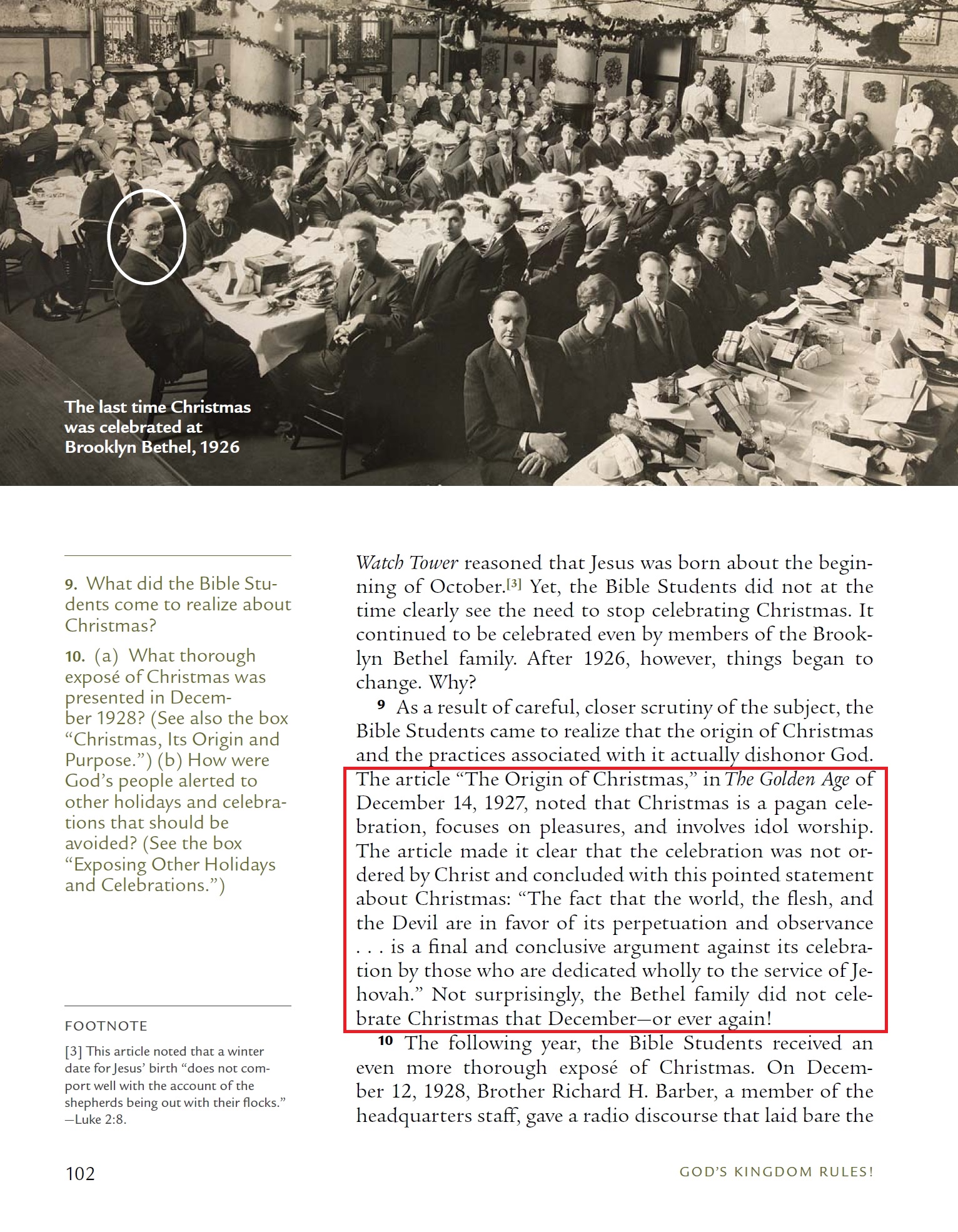 "The Golden Age of December 14, 1927, noted that Christmas is a pagan celebration, focuses on pleasures, and involves idol worship. The article made it clear that the celebration was not ordered by Christ and concluded with this pointed statement about Christmas: “The fact that the world, the flesh, and the Devil are in favor of its perpetuation and observance... is a final and conclusive argument against its celebration by those who are dedicated wholly to the service of Jehovah.” Not surprisingly, the Bethel family did not celebrate Christmas that December—or ever again!"