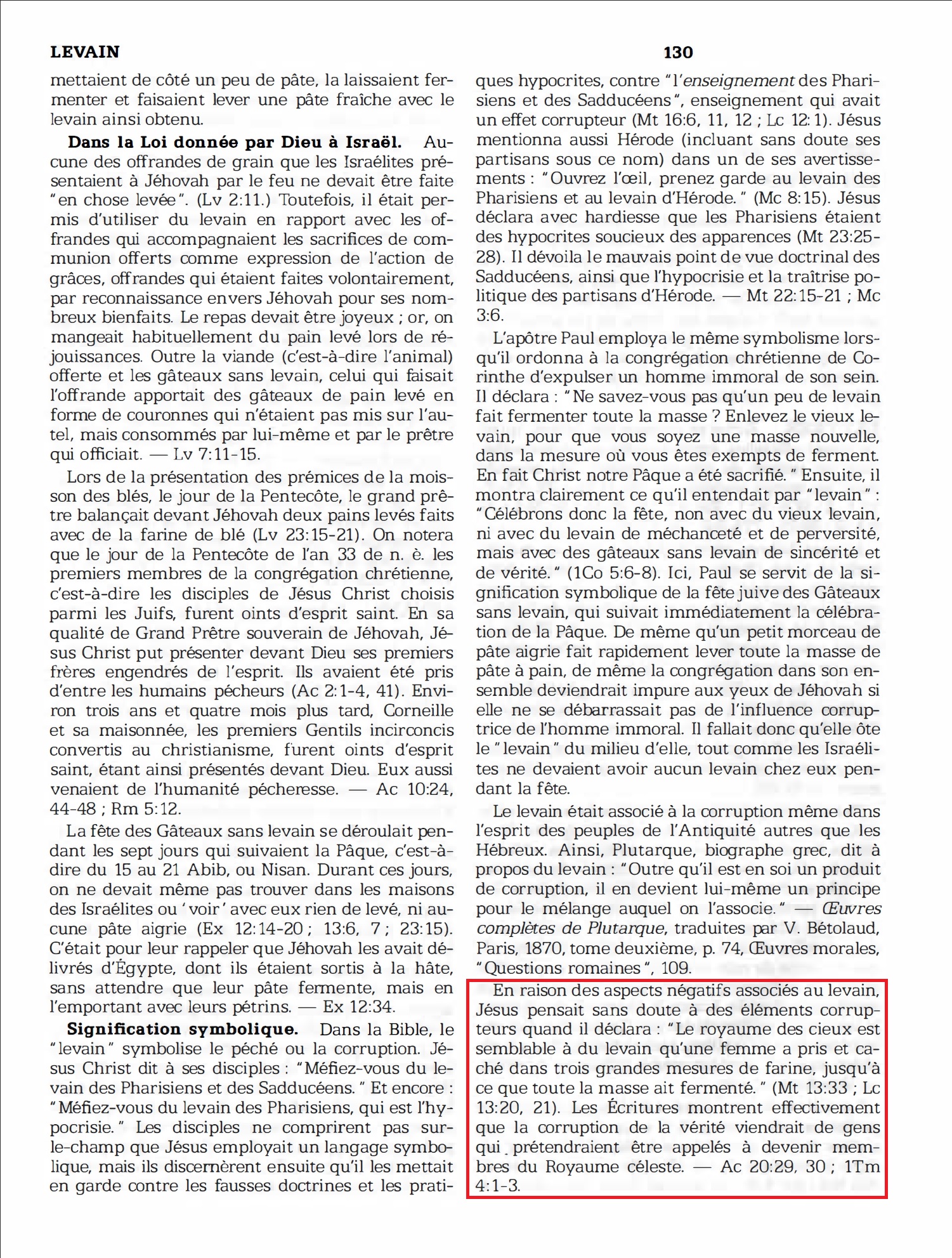 Signification symbolique [...] En raison des aspects négatifs associés au levain, Jésus pensait sans doute à des éléments corrupteurs quand il déclara: "Le royaume des cieux est semblable à du levain qu'une femme a pris et caché dans trois grandes mesures de farine, jusqu'à ce que toute la masse ait fermenté." (Mt 13:33; Lc 13:20, 21). Les Ecritures montrent effectivement que la corruption de la vérité viendrait de gens qui prétendraient être appelés à devenir membres du Royaume céleste. - Ac 20:29, 30; 1Tm 4:1-3. Source : 🇫🇷 Etude perspicace des écritures, Vol.2, page 130 + Cover |