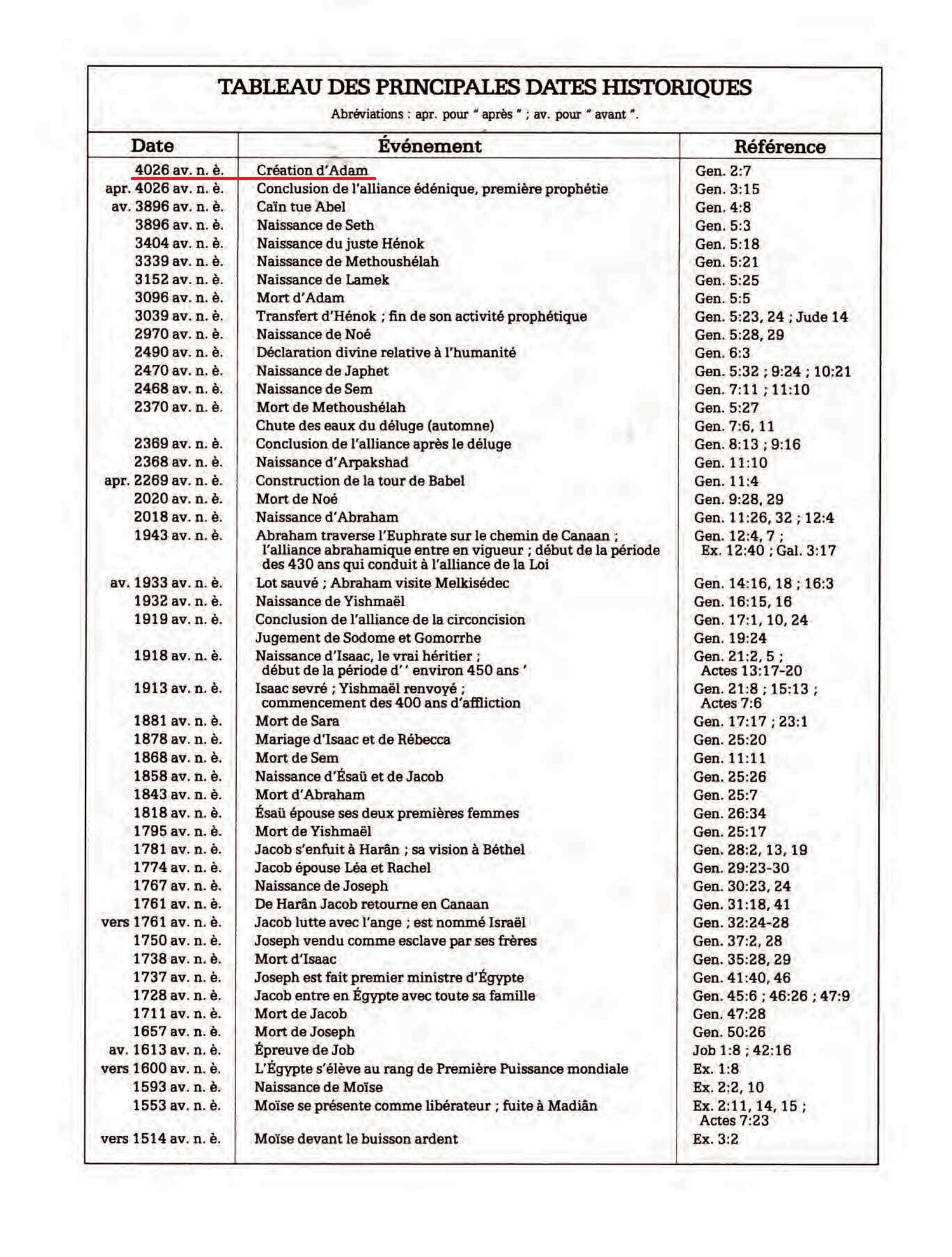 Or, cette chronologie indépendante, déjà publiée*, situe la création de l'homme en 4026 av. notre ère. [...] Date av. n.è. 4026 : Création of Adam (début de l'automne)