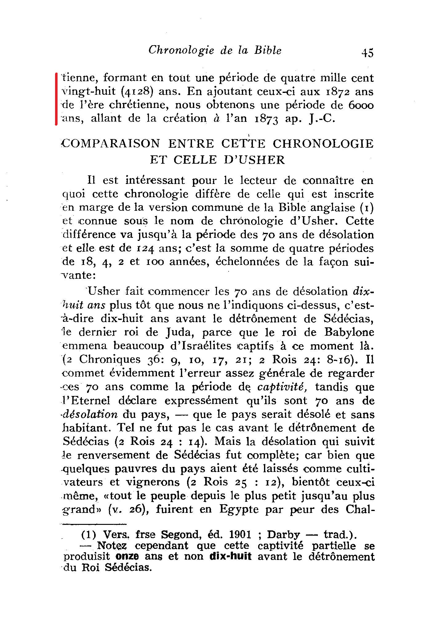 Nous avons donc ainsi établi une ligne de chronologie claire et continue allant de la création à l’ère chrétienne, formant en tout une période de quatre mille cent vingt-huit (4128) ans. En ajoutant ceux-ci aux 1872 ans de l’ère chrétienne, nous obtenons une période de 6ooo ans, allant de la création à l’an 1873 ap. J.-C.