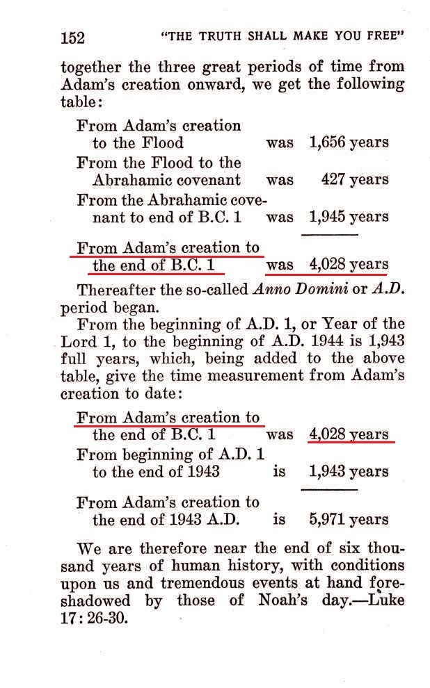 4025 B.C. Adam's creation (in the fall) Gen. 2:7 Source : 🇺🇸 The Watchtower, April 1 1951, page 221 + Cover |