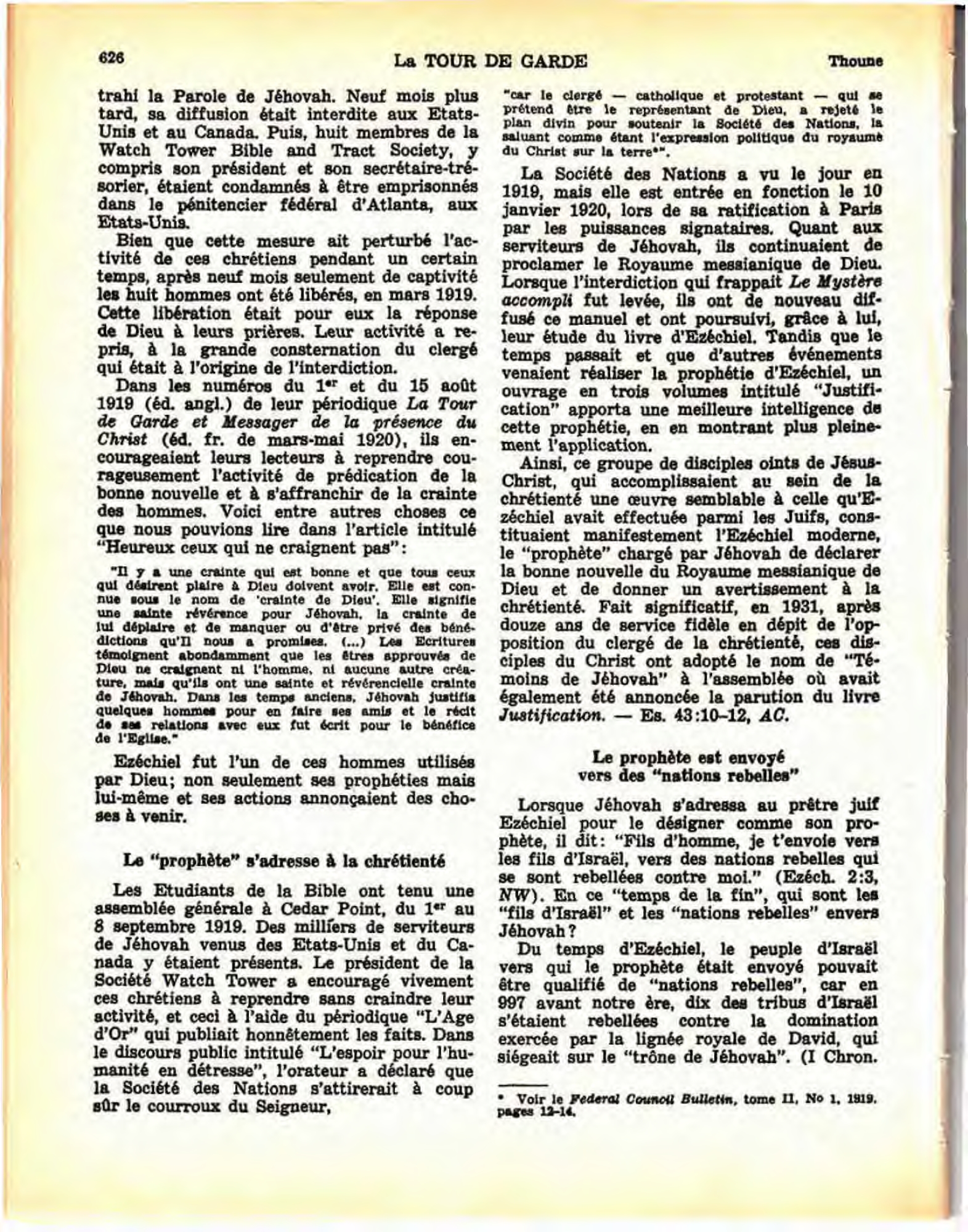 [...] Avant la venue du Seigneur en son temple, bon nombre de personnes qui connaissaient la vérité et avaient répondu à l'appel du Royaume, mais qui, par égoïsme, se rebellèrent contre la lumière, perdirent graduellement la foi. Les « rebelles » dont parle la prophétie comprennent donc tous ceux qui, vers 1917, et par la suite, commencèrent à glisser sur la pente du mal, furent arrachés du royaume et allèrent former la classe du « méchant serviteur ». Source : 🇫🇷 1931 - Justification page 33 + Cover |