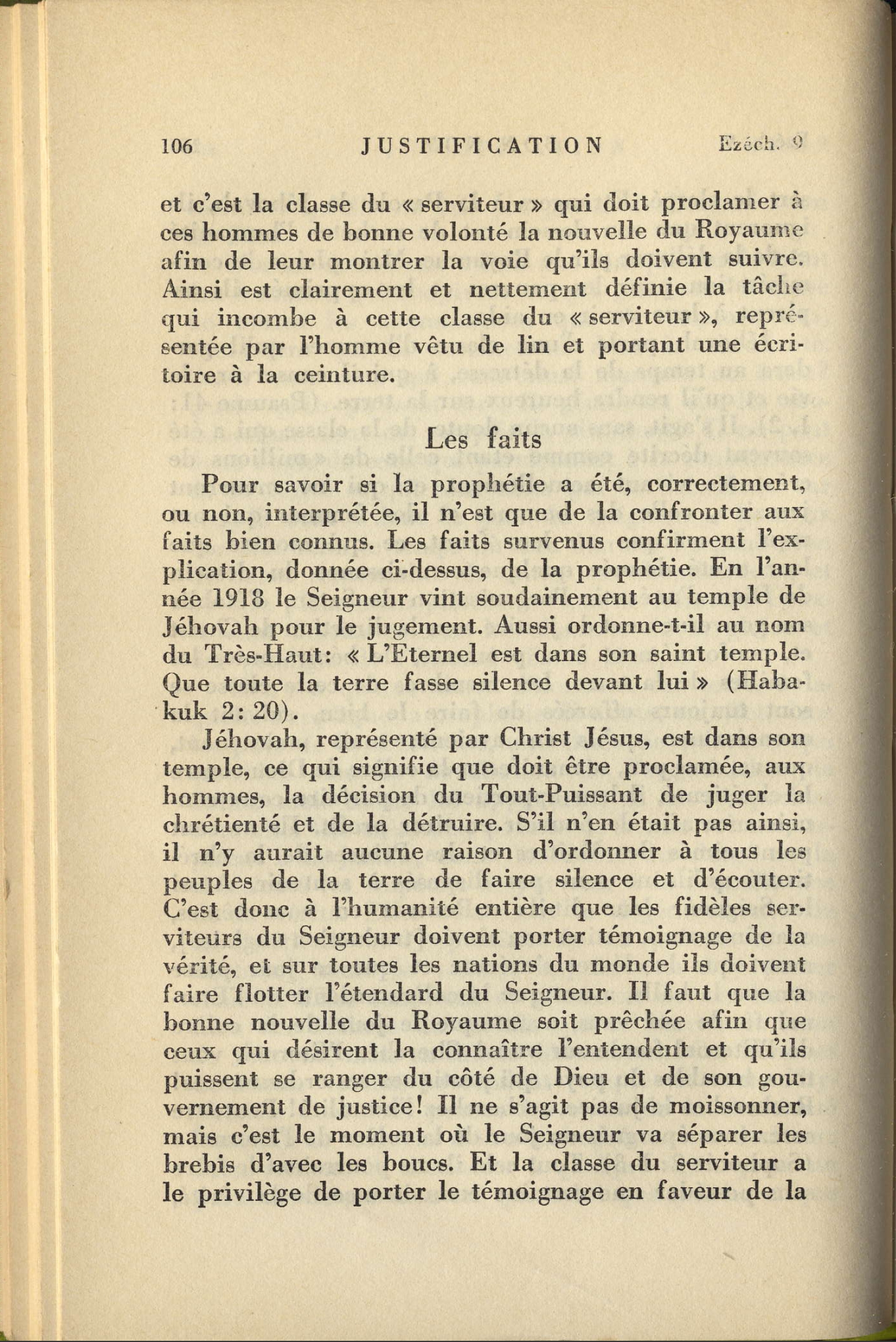 C'est donc à l'humanité entière que les fidèles serviteurs du Seigneur doivent porter témoignage de la vérité, et sur toutes les nations du monde ils doivent faire flotter l'étendard du Seigneur. [...] Et la classe du serviteur a le privilège de porter le témoignage en faveur la vérité et de mettre ainsi les peuples en mesure de prendre parti pour ou contre Dieu et son Royaume (Matthieur 25:31-46). C'est au printemps de 1918 que retentit pour la première fois cette proclamation: « Des millions d'hommes vivant actuellement ne mourront pas. » Peu de temps après, un exposé fut fait en public sur ce sujet, et, inquiète la classe des boucs fit emprisonner de nombreux membres de la classe du « serviteur » dont l'action fut ainsi momentanément paralysée. Mais en 1919, le Seigneur libéra ses dévoués serviteurs, leur inspira une nouvelle ardeur et incita en 1920 la Tour de garde, Société de Bibles et de Tracts, à publier un livre intitulé: « Des millions d'hommes actuellement vivant ne mourront jamais ». Cet ouvrage fut traduit en de nombreuses langues, répandu par millions d'exemplaires dans toutes la chrétienté et mis entre les mains de tous les amis de la vérité. Aussi, lorsqu'arriva l'année 1922, de grands progrès avaient-ils été réalisés dans l'oeuvre du témoignage en faveur de Jéhovah, progrès multipliés encore, peu après, par des conférences publiques portant toujours sur le même sujet « Des millions d'hommes vivant actuellement ne mourront jamais ». C'est ce qui fut fait dans de nombreux pays de la chrétienté. Puis le Seigneur permit d'utiliser la radio pour la proclamation de la vérité, et malgré des résistances de toutes sortes, le message du Royaume est aujourd'hui radiodiffusé d'une façon bien plus étendue que toute autre information. En dix année, ce message, consigné en divers ouvrages, a fait l'objet d'une diffusion telle qu'aucune autre publication n'en a jamais encore connu de semblable. Nombre de personnes, à l'esprit droit, retenues sous la puissance de Satan, parvinrent à la connaissance de la vérité et furent marquées au front, ce qui signifie qu'elles reçurent une compréhension claire du dessein conçu par Dieu d'établir son Royaume pour la justification de son Nom et les bénédiction des peuples. [...] la classe du « serviteur » qui a pour devoir essentiel de parcourir la « chrétienté » et d'apposer la marque au front. [...] elle accomplit l'oeuvre dont l'a chargé le seigneur et qui est figurée dans la vision du prophète Ezéchiel. Source : 🇫🇷 1931 - « Justification - Tome 1 » page 106 + page 107 + page 108 + Cover |