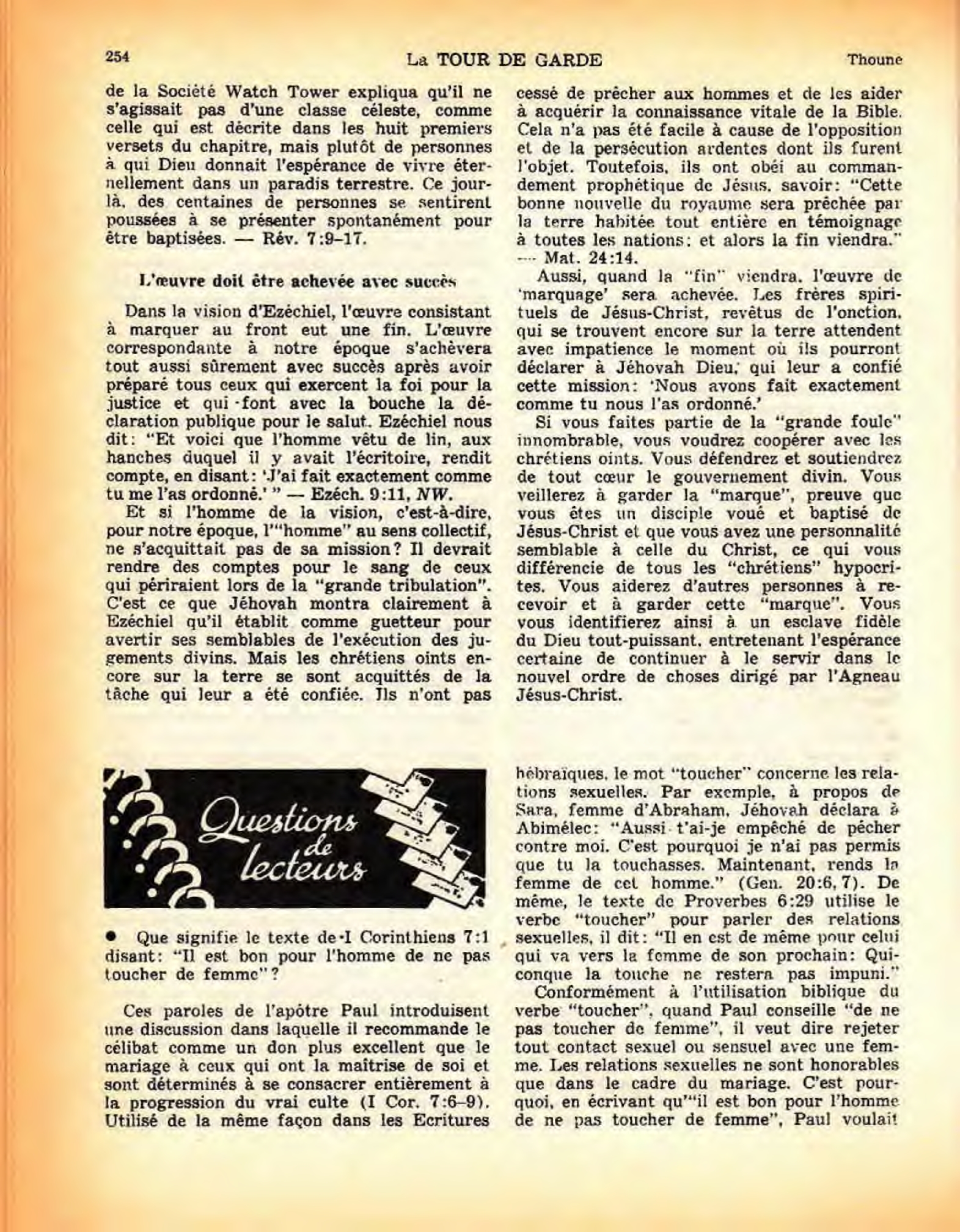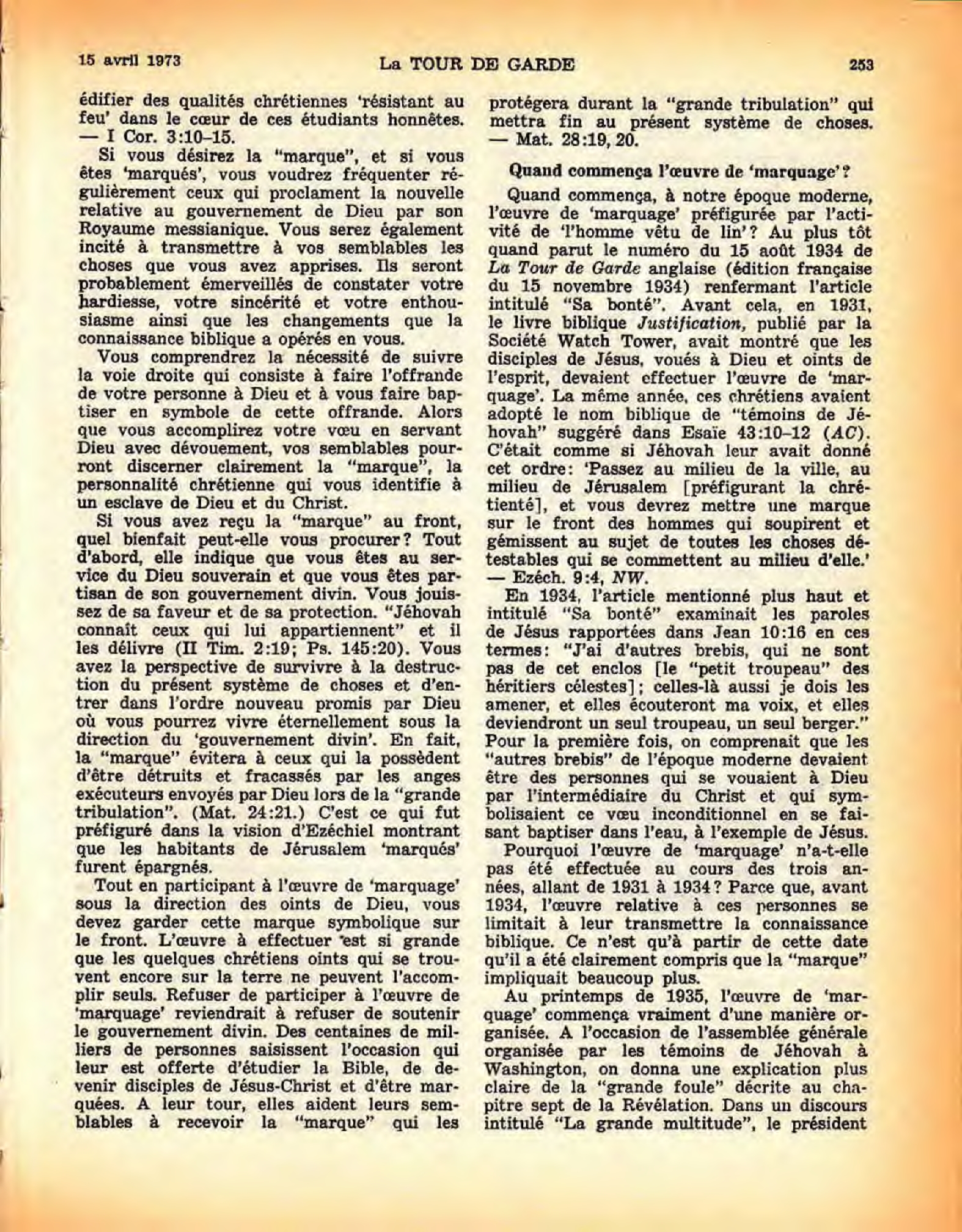 35. Par conséquent, en 1934, soit trois années après la publication du livre Justification (tome I), le périodique La Tour de Garde, édition française du 15 novembre 1934, publia un article intitulé “Sa bonté”. Les pages 345 et 346 de ce journal expliquèrent clairement que même les “autres brebis” de notre époque doivent se vouer à Dieu par l’intermédiaire du Christ et symboliser cette offrande inconditionnelle en se faisant baptiser dans l’eau, à l’exemple de Jésus. Ce fut au plus tôt à ce moment-là que les membres du reste oint commencèrent à marquer au front ceux que Dieu épargnera pendant la “grande tribulation” qui doit s’abattre sur la chrétienté, la Jérusalem infidèle antitypique. Pourquoi? Parce que, avant cette date, le reste s’était borné à leur transmettre des connaissances bibliques (Matthieu 24:15-22; Marc 13:14-20). Cependant, même là, le reste n’avait pas compris que les “autres brebis” de notre époque étaient identiques aux membres de la “grande multitude” ou “grande foule” annoncée prophétiquement dans Révélation 7:9-17. C’est pourquoi jusque-là aucun effort organisé n’avait été fait pour rassembler les “autres brebis”.