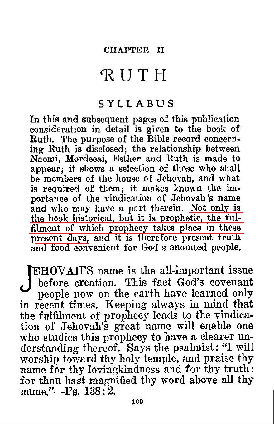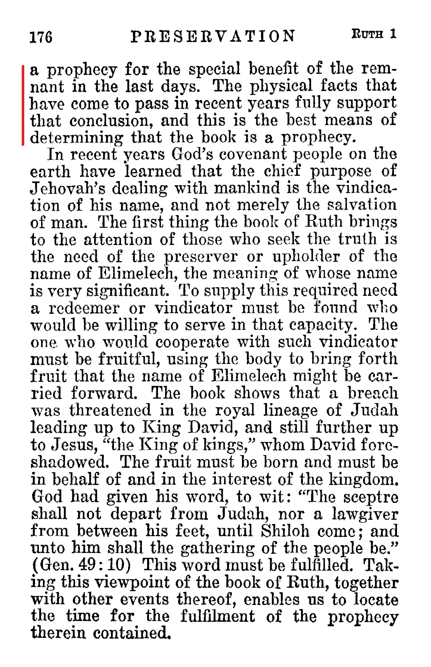 [...] Not only is the book historical, but it is prophetic, the fulfilment of wich prophecy takes place in these present days, and it is therefore present truth and food convenient for God's anointed people. [...] Based upon this Scriptural authority we must conclude that the book of Ruth was made a part of God’s Word or message as a prophecy for the special benefit of the remnant in the last days. The physical facts that have come to pass in recent years fully support that conclusion, and this is the best means of determining that the book is a prophecy. Source : 🇺🇸 Preservation, 1932, page 169 + page 175 + page 176 + Cover |