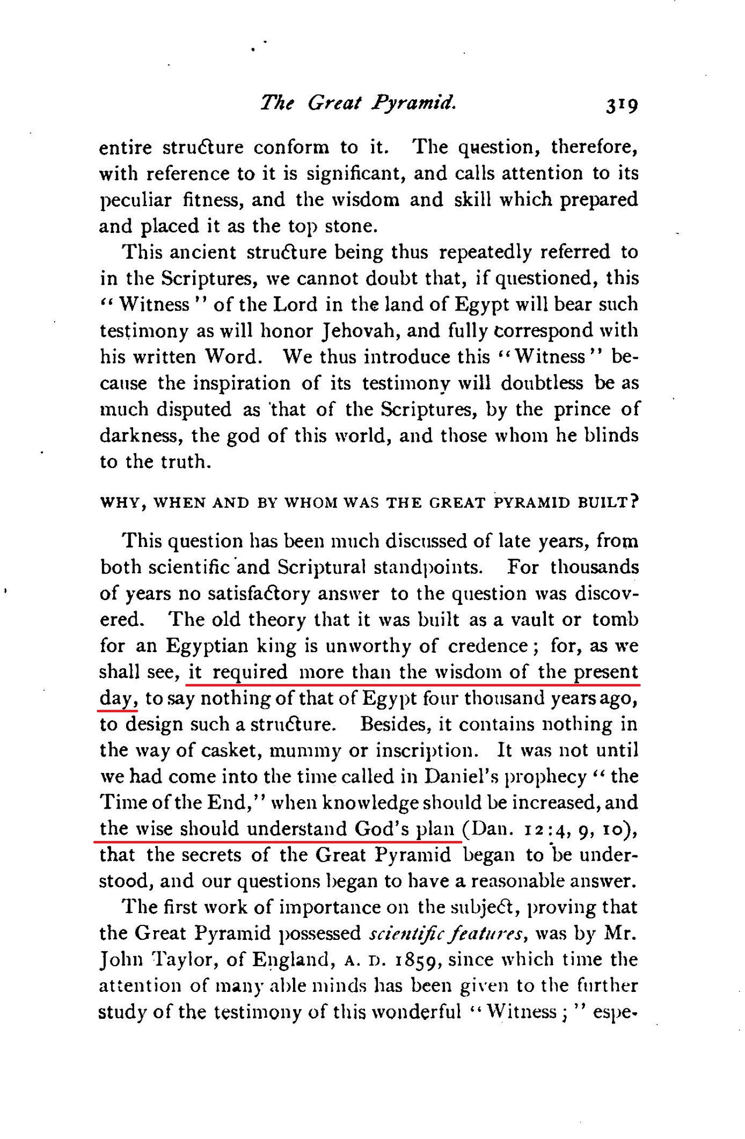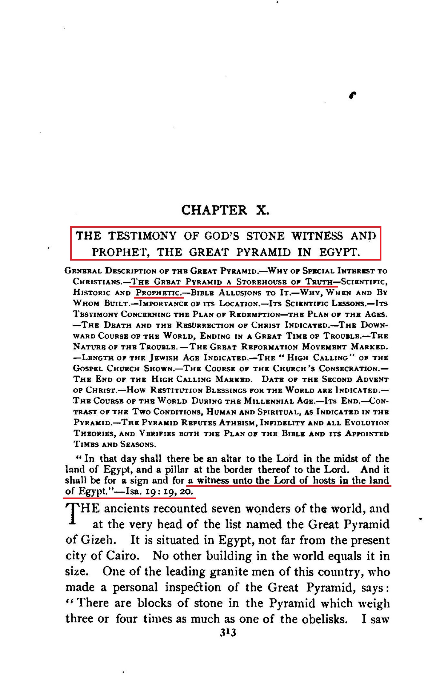 [...] THE GREAT PYRAMID A STOREHOUSE OF TRUTH - SCIENTIFIC, HISTORIC AND PROPHETIC. - BIBLE ALUSSIONS TO IT. - WHY, WHEN AND BY WHOM BUILT. - IMPORTANCE OF ITS LOCATION. - ITS SCIENTIFIC LESSON. - ITS TESTIMONY CONCERNING THE PLAN OF REDEMPTION - THE PLAN OF THE AGES. - THE DEATH AND THE RESURRECTION OF CHRIST INDICATED. [...] DATE OF THE SECOND ADVENT OF CHRIST. [...] "In that day shall there be an altar to the Lord in the midst of the land of Egypt, and a pillnr at the border thereof to the Lord. And it shall be for a sign and for a witness unto the Lord of hosts in the land of Egypt." - Isa. 19:19, 20. Source : 🇺🇸 1891 (first ed.) - Thy Kingdom Come, Studies in the Scriptures, vol. III, 1891, Chapter X, page 313 - [archive.org] |