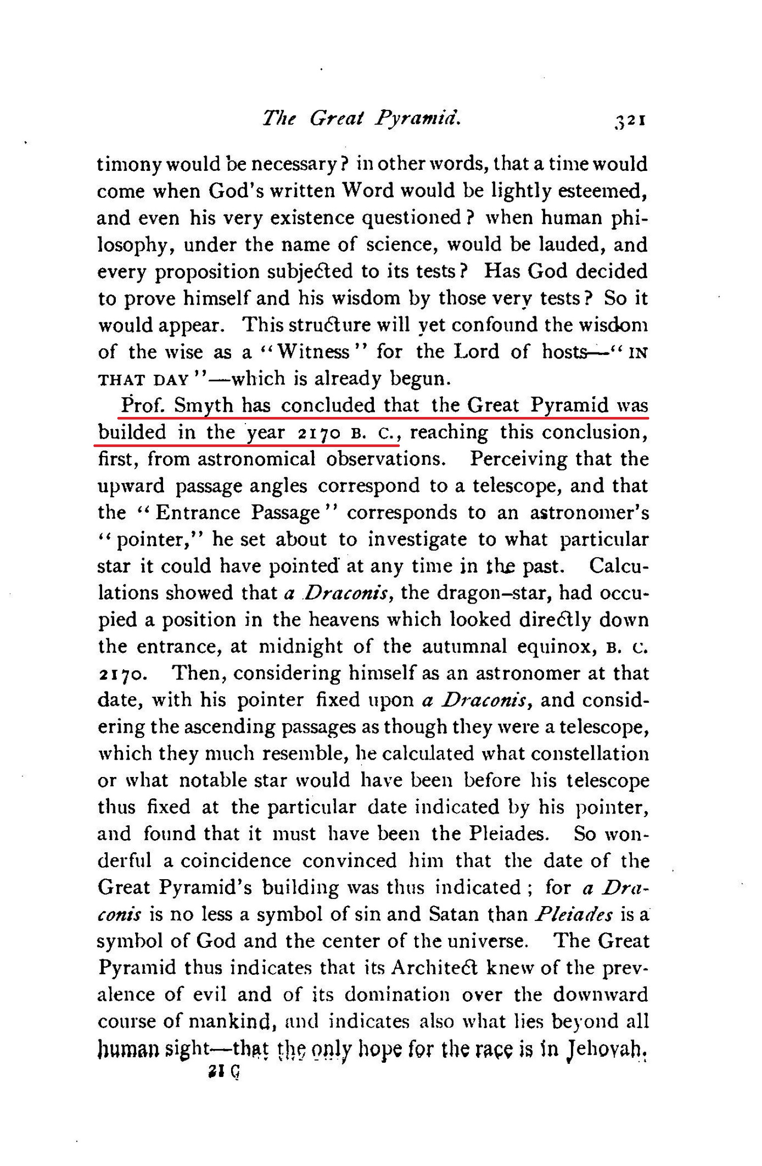Prof. Smyth has concluded that the Great Pyramid was builded in the year 2170 B.c. [...] This conclusion of Prof. Smyth's as to the date of the Great Pyramid's building, was most abundantly corroborated, later, by certain measurements by which the Great Pyramid indicates its own date of construction. A realization of the fact that the Great Pyramid exhibits a wisdom of design which the Egyptians could not have possessed a divine wisdom which must have been worked out under the supervision of some inspired servant of God - has led to the conjecture that Melchizedek was its builder. He was "king of Salem [that is, king of peace] and priest of the Most High God," and as a person and type occupied so high a position as to be a blesser of Abraham, who also paid him tithes. Of this we can know little, except that Melchizedek was a great and peaceful king, and that he lived about that time, and not far distant from the site of the Great Pyramid.