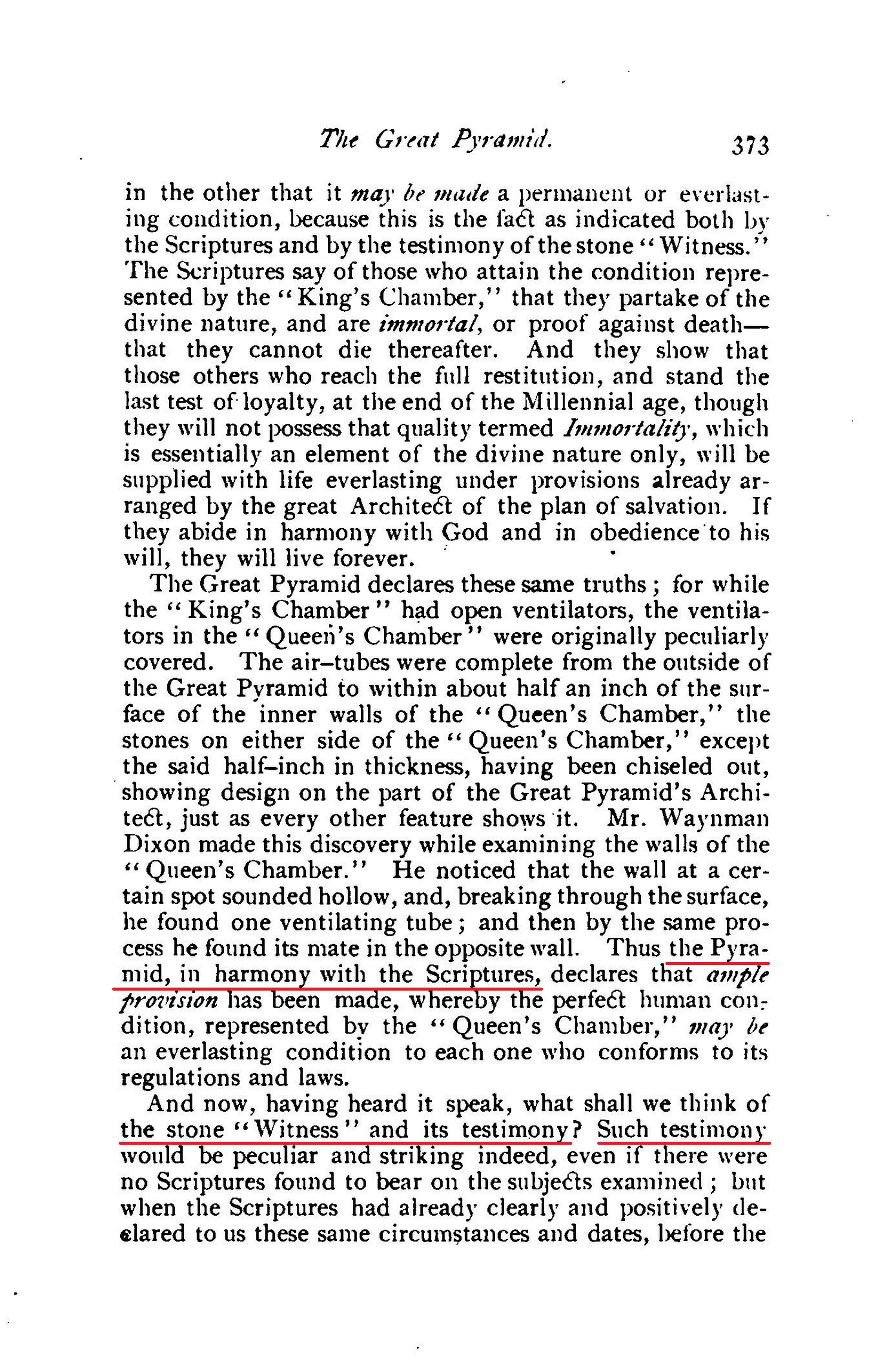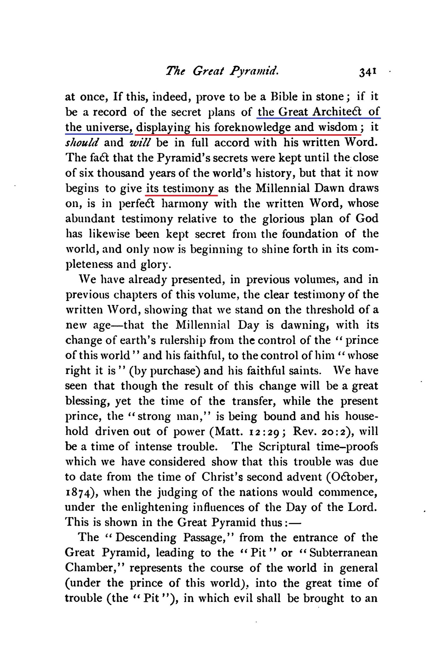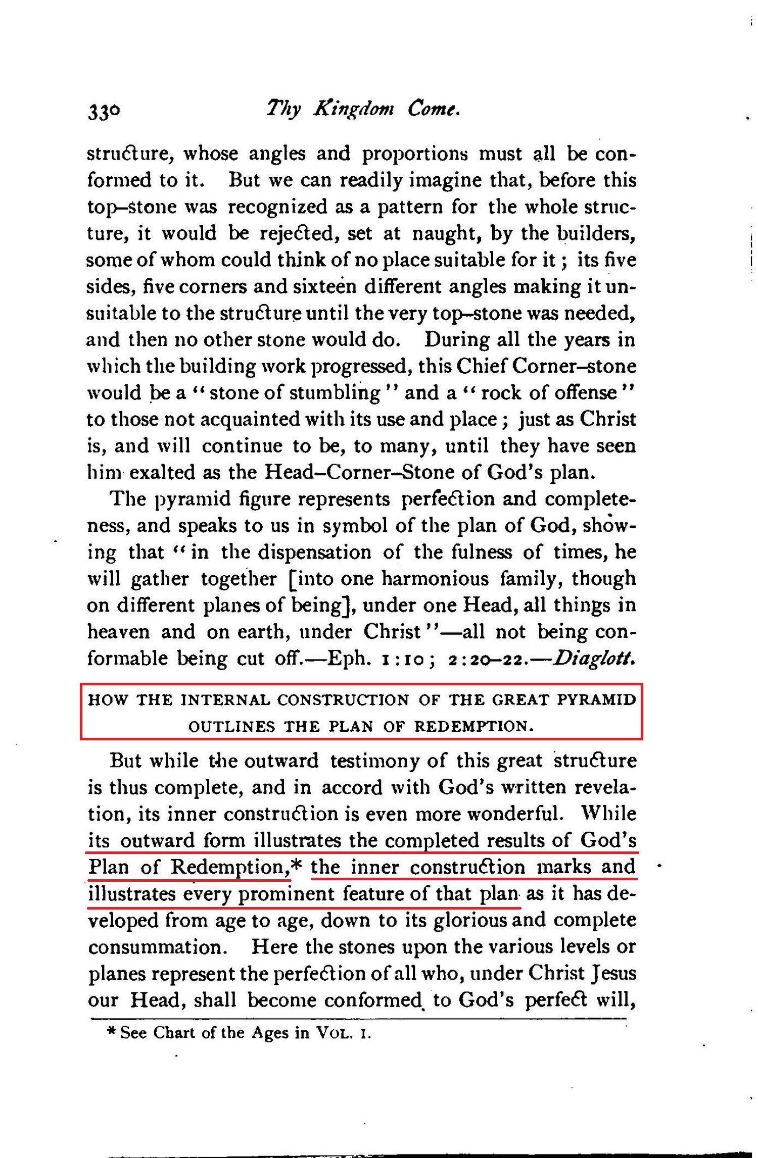 [...] and showing, also, that the Great Pyramid of Egypt is one of God's Witnesses (Isa. 19:19-20), whose wonderful message is a full and complete corroboration of God's plan of the ages, together with its times and seasons.