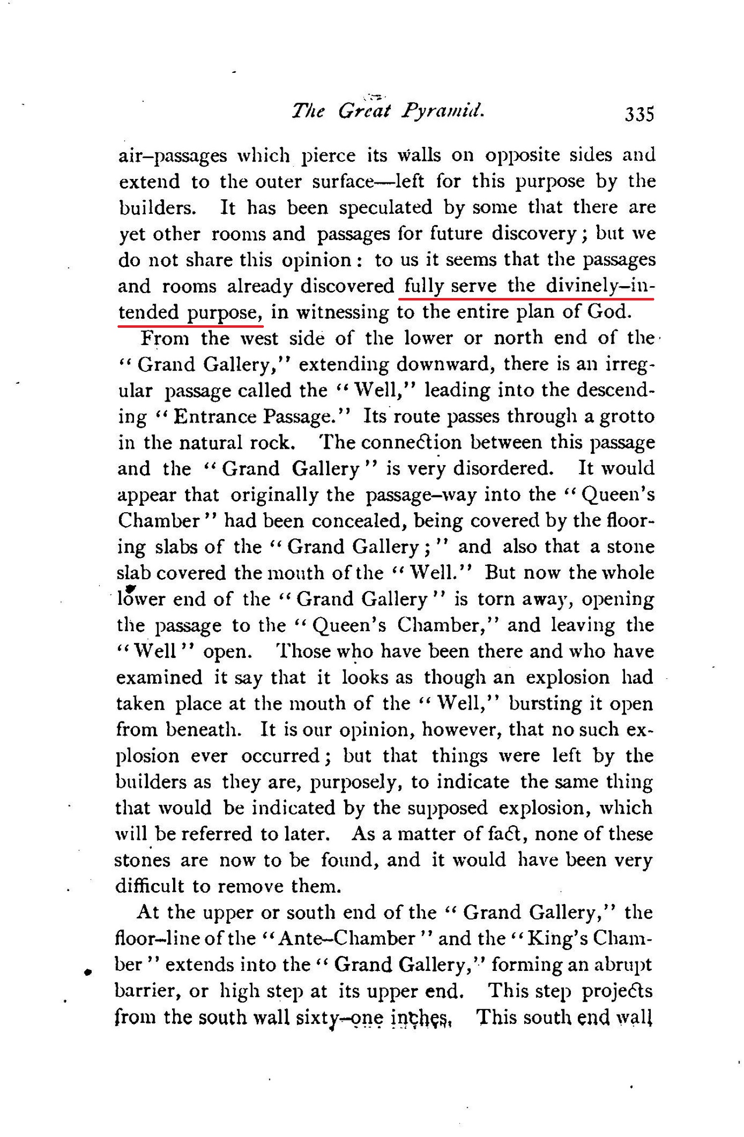 [...] yet the Great Pyramid should, in some way, indicate the full length of Israel's favor. This we finally found to be most ingeniously shown. The granite "Plug" proved to be the exact length to fill out this period to the very limit. Then we knew why that "Plug" was so securely fixed that none had succeeded in displacing it. The great Master-Builder had placed it there to stay, that me might hear its testimony. to-day corroborating the Bible, as to both its plan and its chronology. [...] Thus, exactly, does the stone "Witness" corroborate the testimony of the Bible, and show that the period from the exodus of Israel from Egypt until the full end of their national favor, A. D. 36, was 1650 years. [...] And not only was this an ingenious way of hiding and yet furnishing the length of the period from the exodus to the birth of our Lord (to be, in due time, a corroboration of the Bible testimony), but the careful reader will readily see that it could have been done only in some such may, [...]