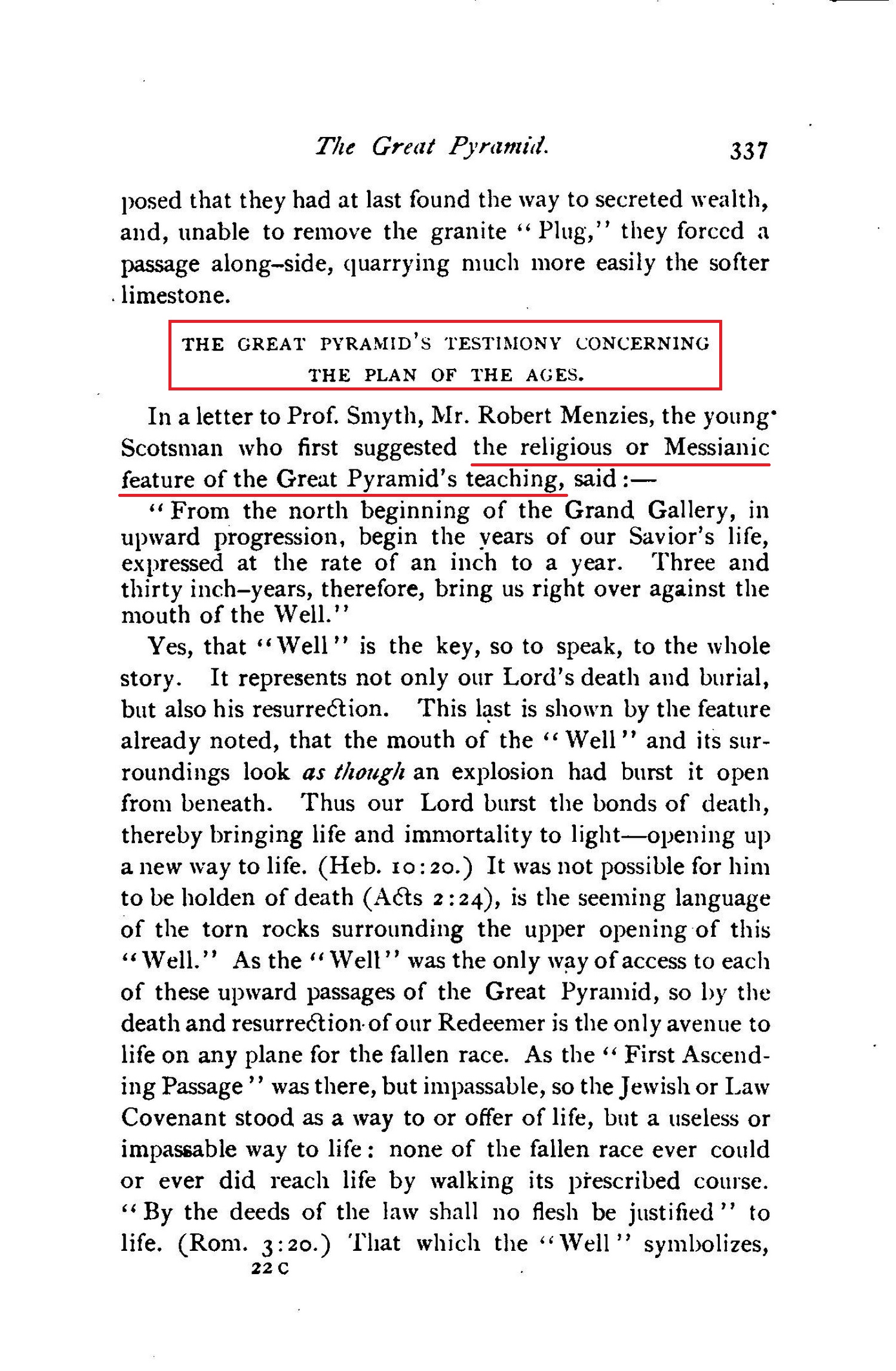 A few year's after Prof. Smyth's return, came the suggestion that the Great Pyramid is Jehovah's "Witness," and that it is as important a witness to divine truth as to natural science. This was a new thought to Prof. Smyth, as well as to others. The suggestion came from a young Scotsman, Robert Menzies, who, when studying the scientific teachings of the Great Pyramid, discovered that prophetic and chronological teachings co-exist in it. Soon it became apparent that the object of its construction was to provide in it a record of the divine plan of salvation, no less than the record of divine wisdom relating to astronomical, chronological, geometrical, and other important truths. However, not having discerned the scope and completeness of the plan of salvation revealed in the Scriptures, these gentlemen have thus far failed to note the most wonderful and beautiful features of the Great Pyramid's testimony in this direction, which we now find to be a most full and complete corroboration of the plan of the ages and the times and seasons therewith associated, as taught in the Scriptures and presented in this and the preceding volumes of the MILLENNIAL DAWN series. And, further, we see that this store-house of knowledge: like the major part of the Bible store, was kept purposely sealed until its testimony should be needed and appreciated. Does this imply that its great Architect knew that a time would come when its testimony would be necessary? in other words, that a time would come when God's written Word would be lightly esteemed, and even his very existence questioned? when human philosophy, under the name of science, would be lauded, and every proposition subjected to its tests? Has God decided to prove himself and his wisdom by those very tests? So it would appear. This structure will yet confound the wisdom of the wise as a "Witness" for the Lord of hosts- "IN THAT DAY" - which is already begun. Source : 🇺🇸 1891 (first ed.) - Thy Kingdom Come, Studies in the Scriptures, vol. III, 1891, Chapter X, page 319, page 320, page 321 - [archive.org] |
