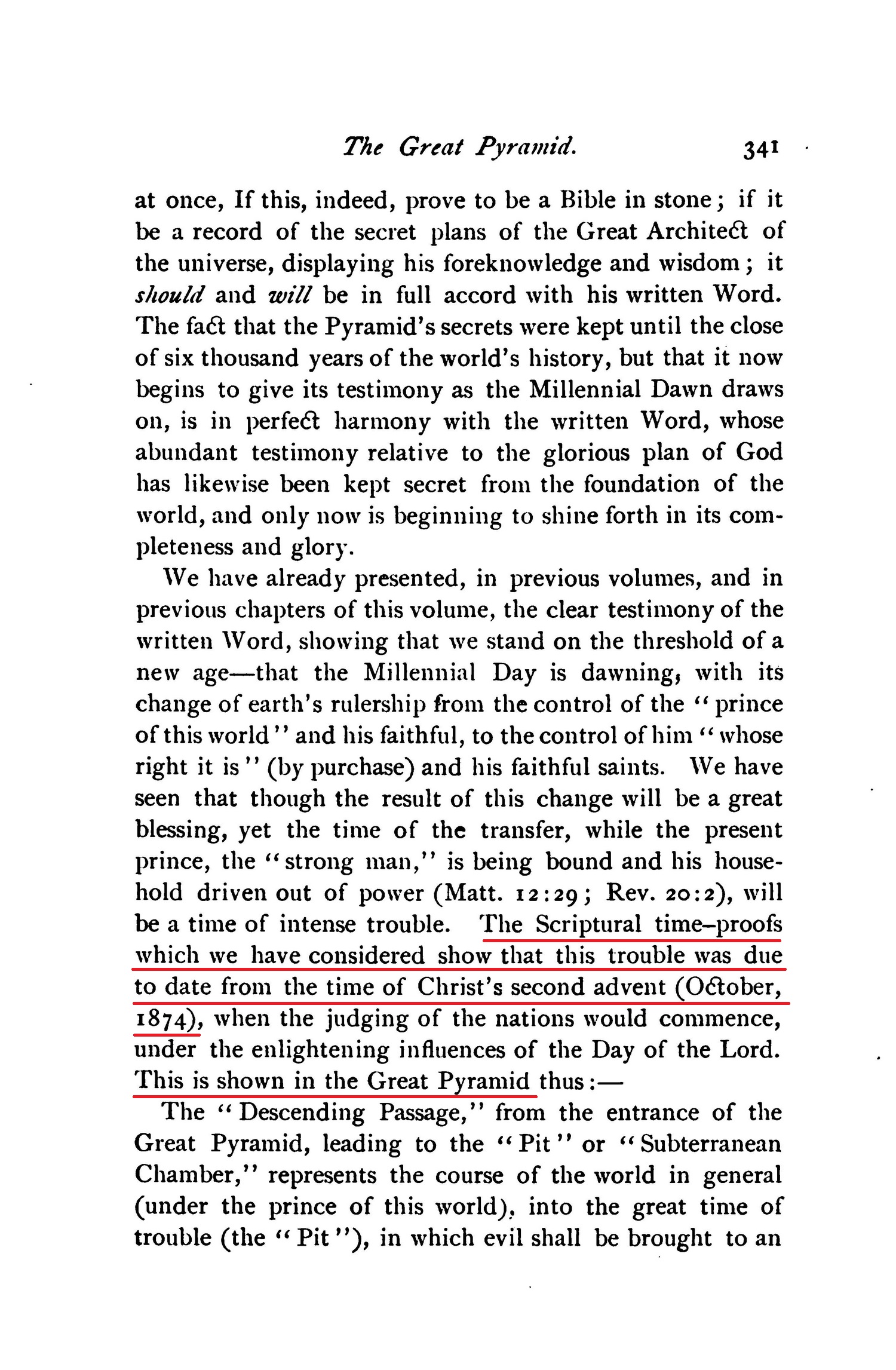 The "Descending Passage," from the entrance of the Great Pyramid, leading to the "Pit" or "Subterranean Chamber," represents the course of the world in general (under the prince of this world), into the great time of trouble (the "Pit"), in which evil shall be brought to an end. [...] This calculation shows A. D. 1874 as marking the beginning of the period of trouble; for 1542 years B. c. plus 1874 years A. D. equals 3416 years. Thus the Pyramid witnesses that the close of 1874 was the chronological beginning of the time of trouble such as was not since there was a nation-no, nor ever shall be afterward. And thus it will be noted that this "Witness" fully corroborates the Bible testimony on this subject, as shown by the "Parallel Dispensatidns" in MILLENNIAL DAWN, VOL.II., Chap. vii. Source : 🇺🇸 1891 (first ed.) - Thy Kingdom Come, Studies in the Scriptures, vol. III, 1891, Chapter X, page 341, page 342 - [archive.org] |