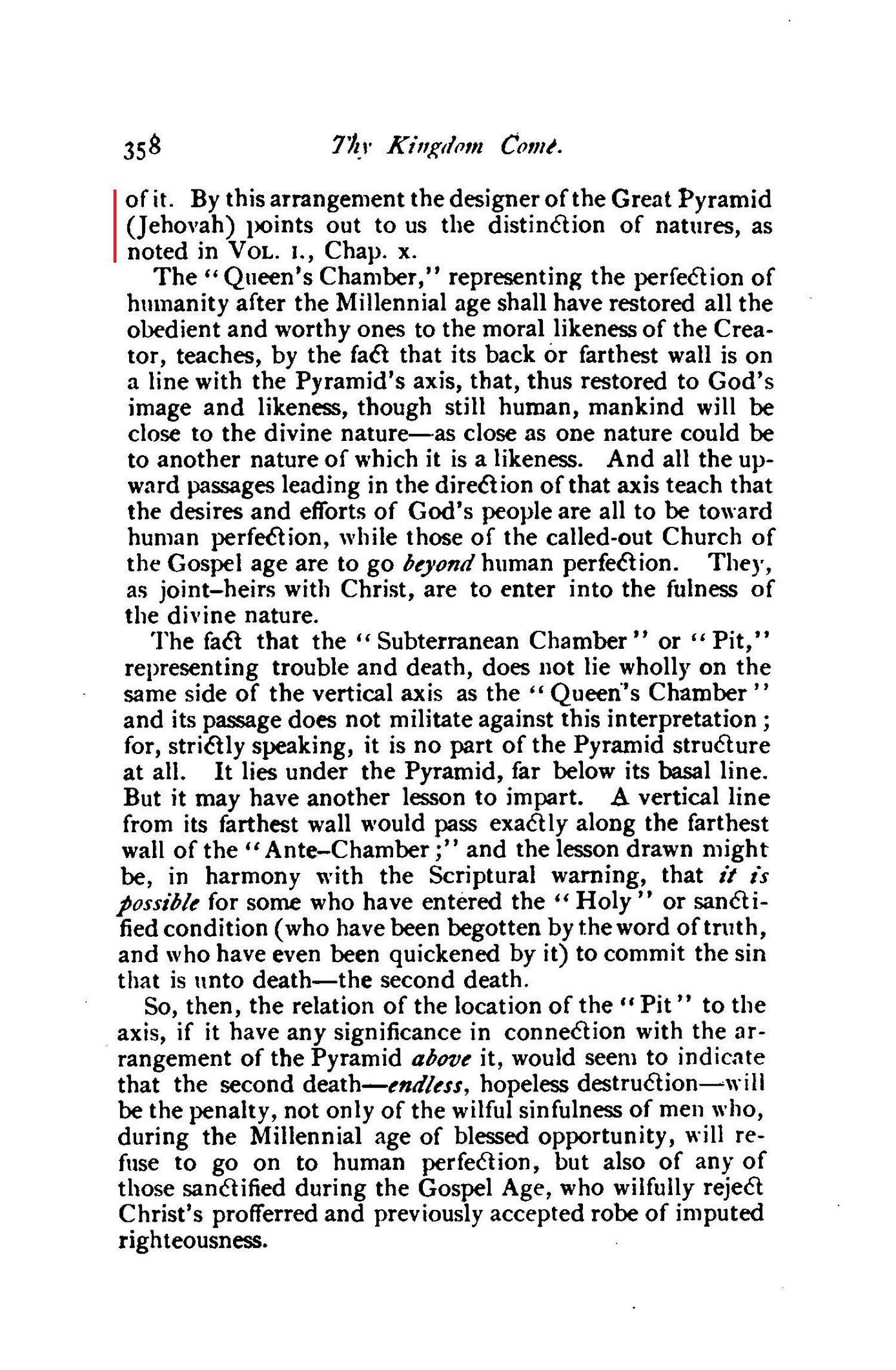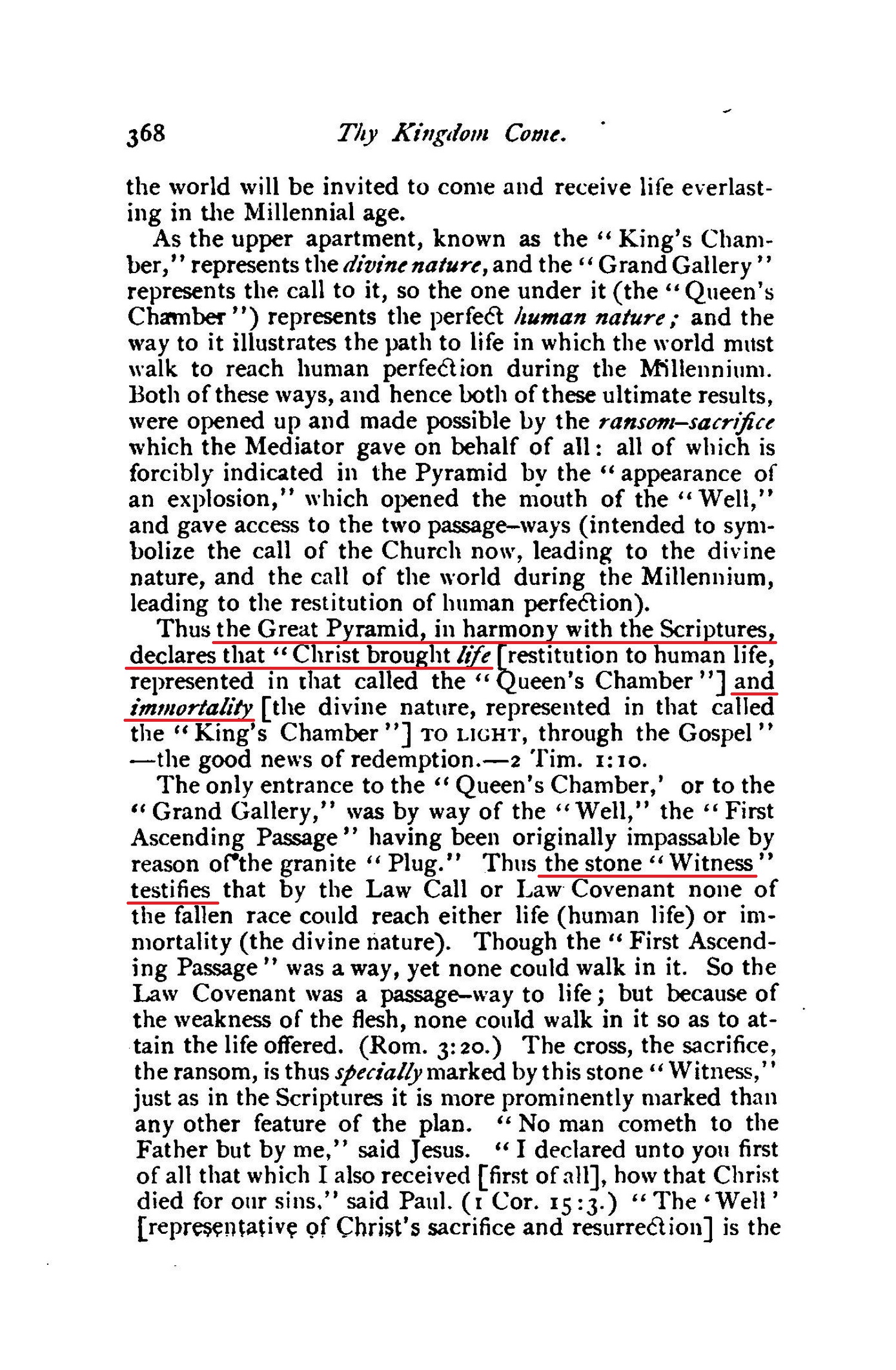 Thus the Great Pyramid, in harmony with the Scriptures, declares that "Christ brought life [restitution to human life, represented in that called the "Queen's Chamber"] and immortality [the divine nature, represented in that called the "King's Chamber"] TO LIGHT, through the Gospel"