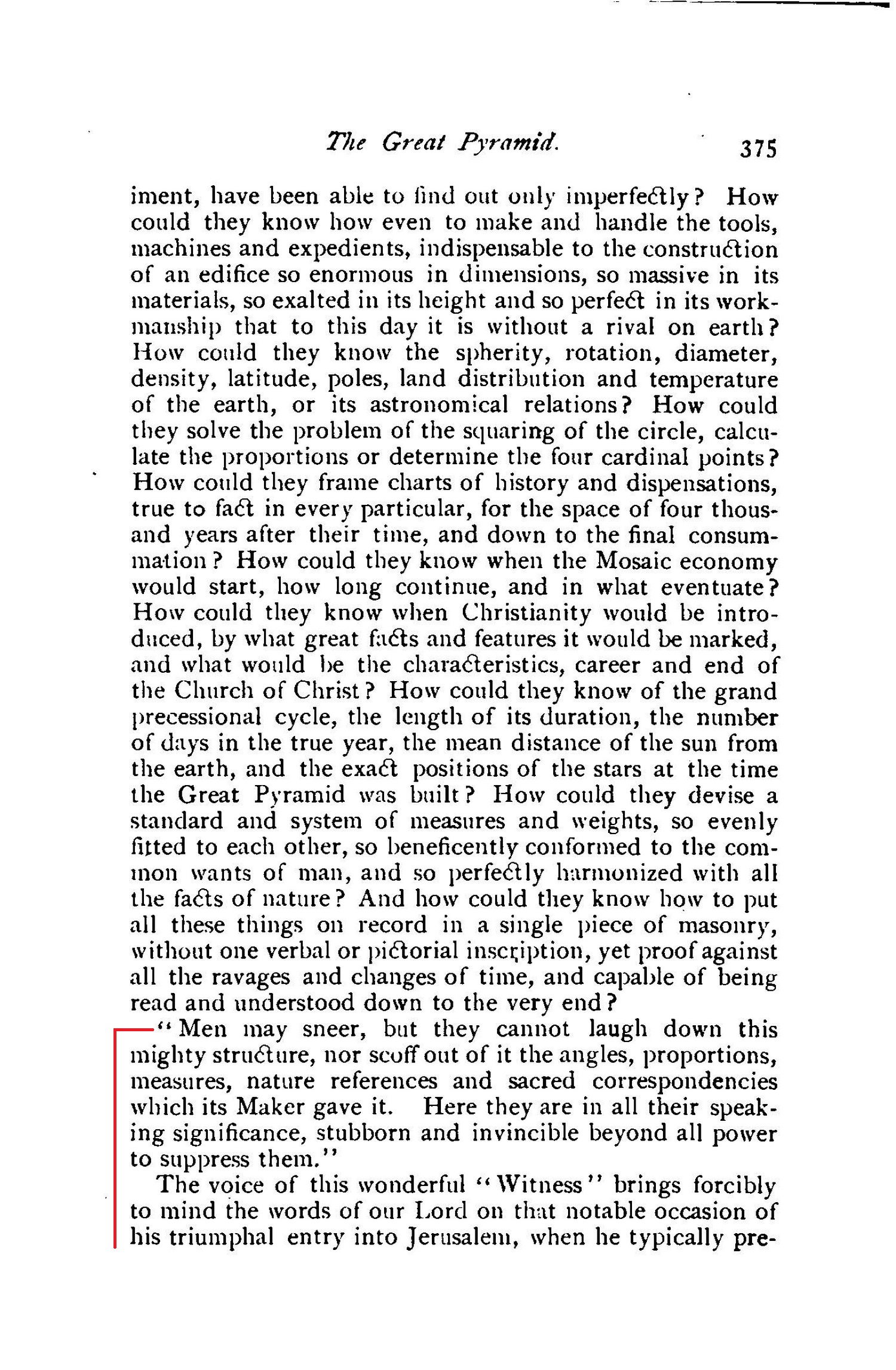 And when the Pharisees were urging him to rebuke them, he answered,"I tell you that if these should hold their peace, the stones would immediately cry out." (Luke 19:37-40.) [...] lo, the very stones of this Great Pyramid of Testimony are crying out in no uncertain tones. Every inch of this massive structure is eloquently proclaiming the wisdom and power and grace of our God.