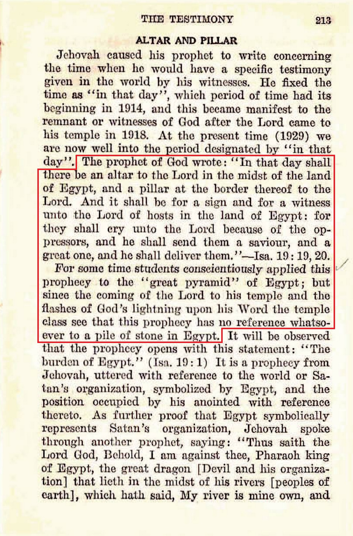For some time students conscientiously applied this prophecy to the “great pyramid” of Egypt; but since the coming of the Lord to his temple and the flashes of God’s lightning upon his Word the temple class see that this prophecy has no reference whatsoever to a pile of stone in Egypt. Source : 🇺🇸 1929 - Prophecy, page 213 + Cover |