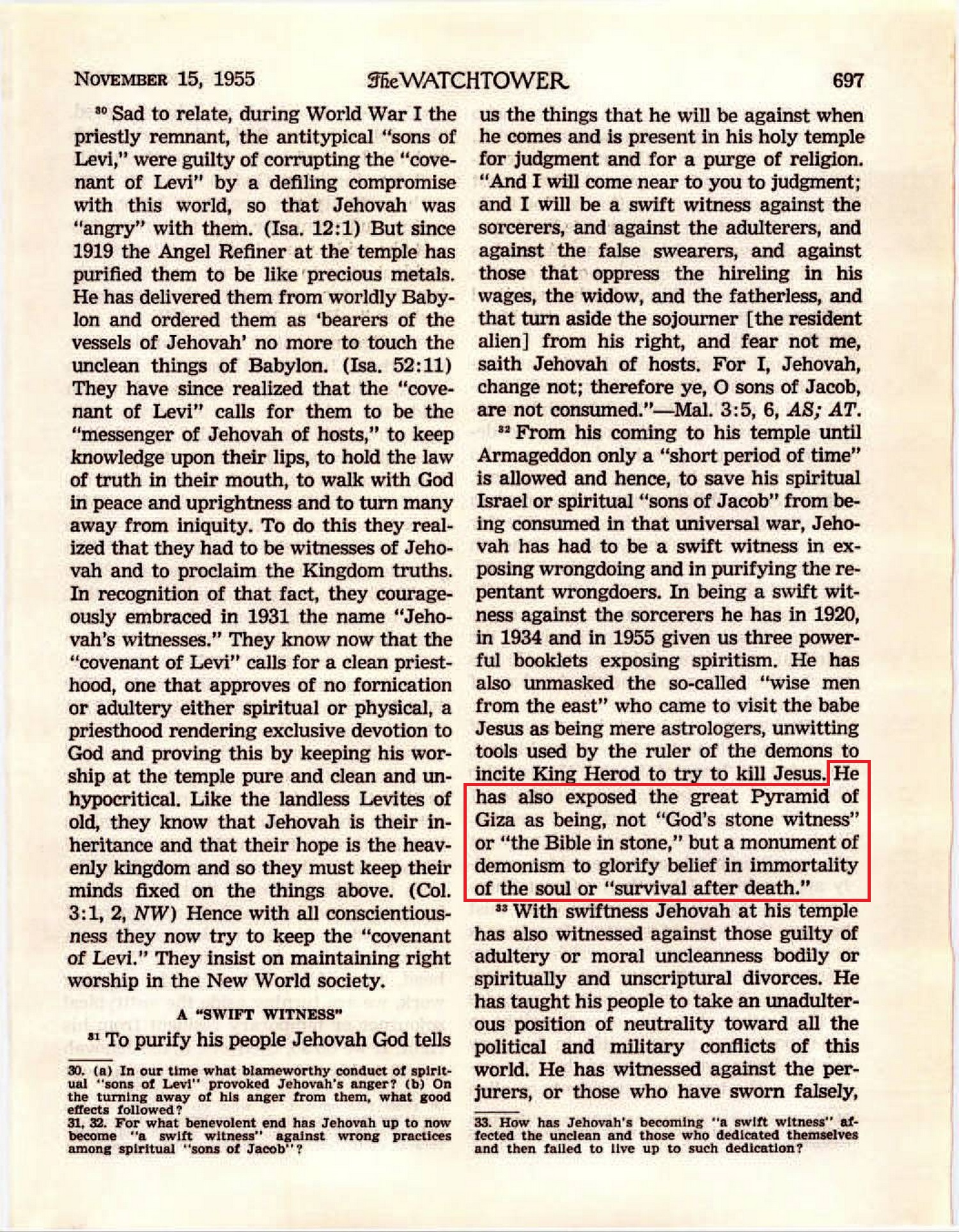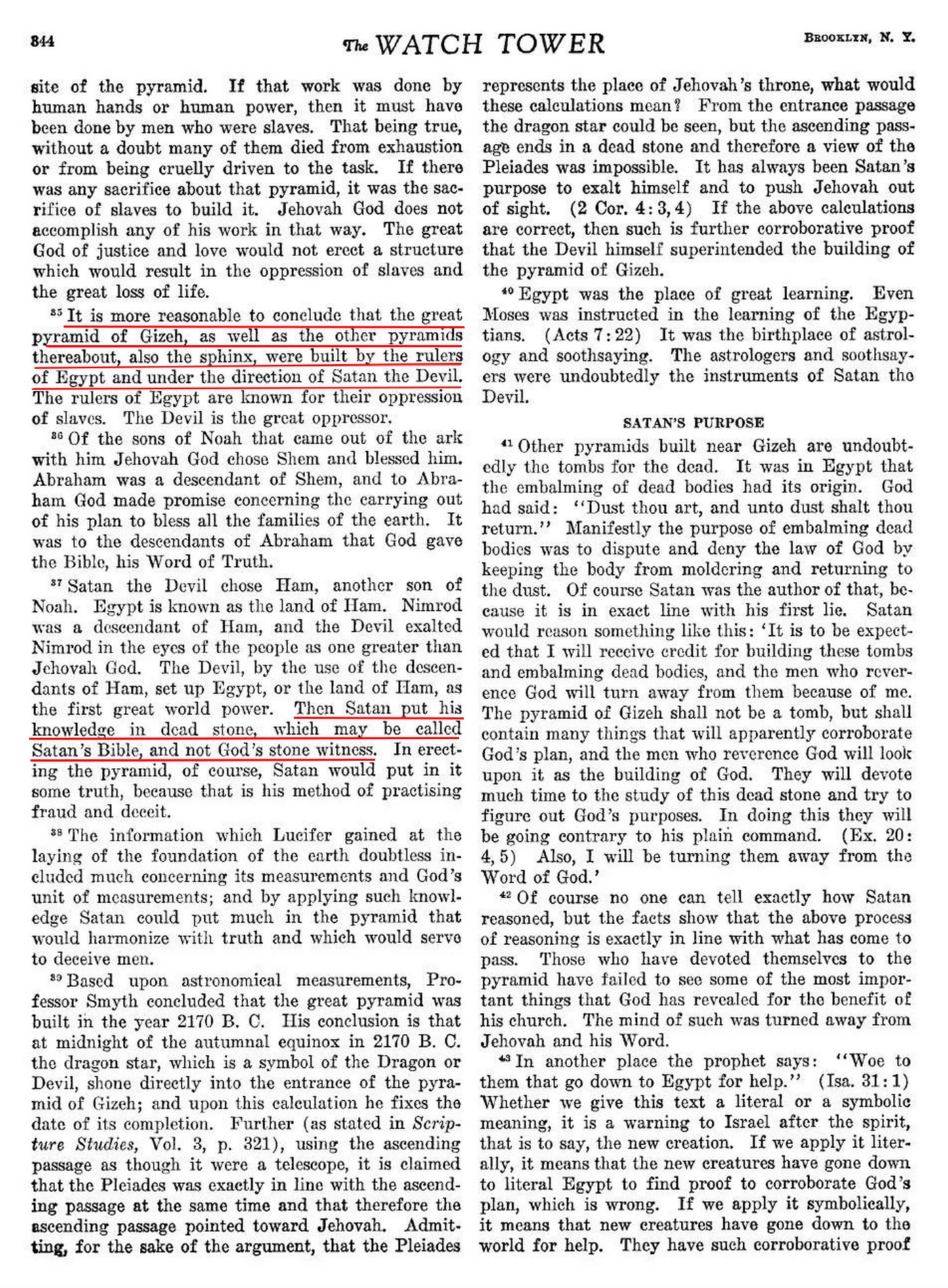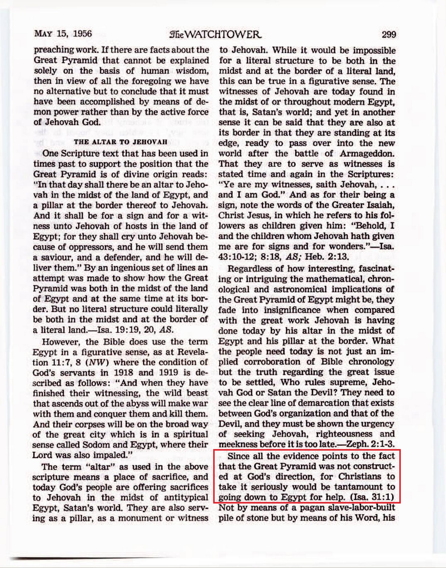 Thus, this most logical explanation of all as to the reasons underlying the construction of the Great Pyramid of Giza would indicate that it certainly was not built by those engaging in the true worship of Jehovah God but by those devoted to astrology, a manifestation of Devil religion, and was built in furtherance of such religion. Source : 🇺🇸 The Watchtower, May 15 1956, page 300 + Cover |