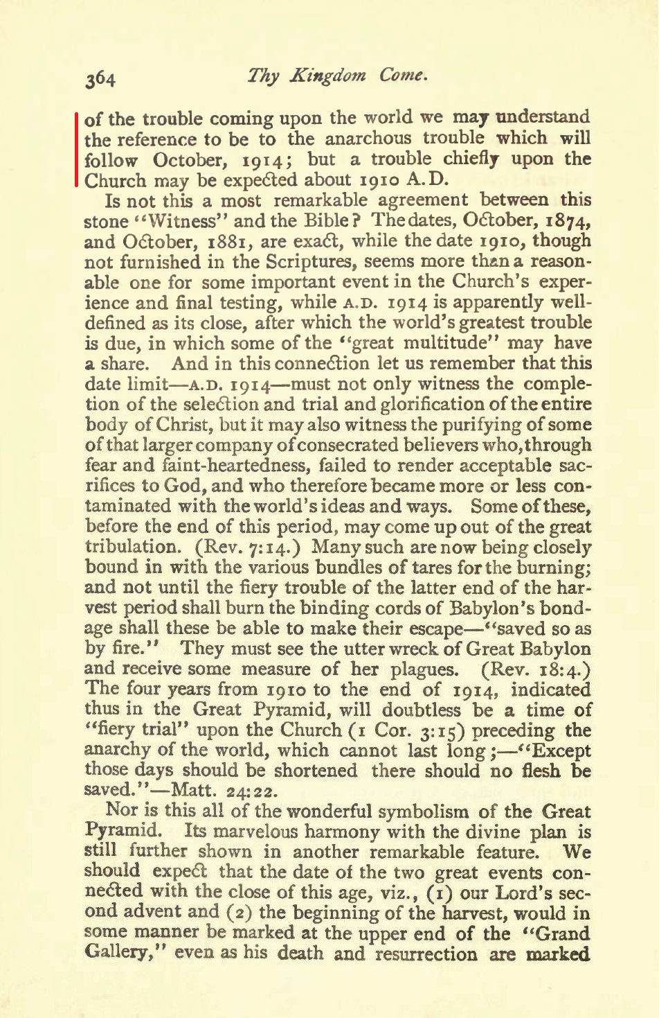 but this date, 1910, indicated by the Pyramid, seems to harmonize well with the dates furnished by the Bible. [...] we may well accept as correct the testimony of the Great Pyramid, that the last members of the "body" or "bride" of Christ will have been tested and accepted and will have passed beyond the vail before the close of A.D. 1910. [...] Is not this a most remarkable agreement between this stone "Witness" and the Bible?