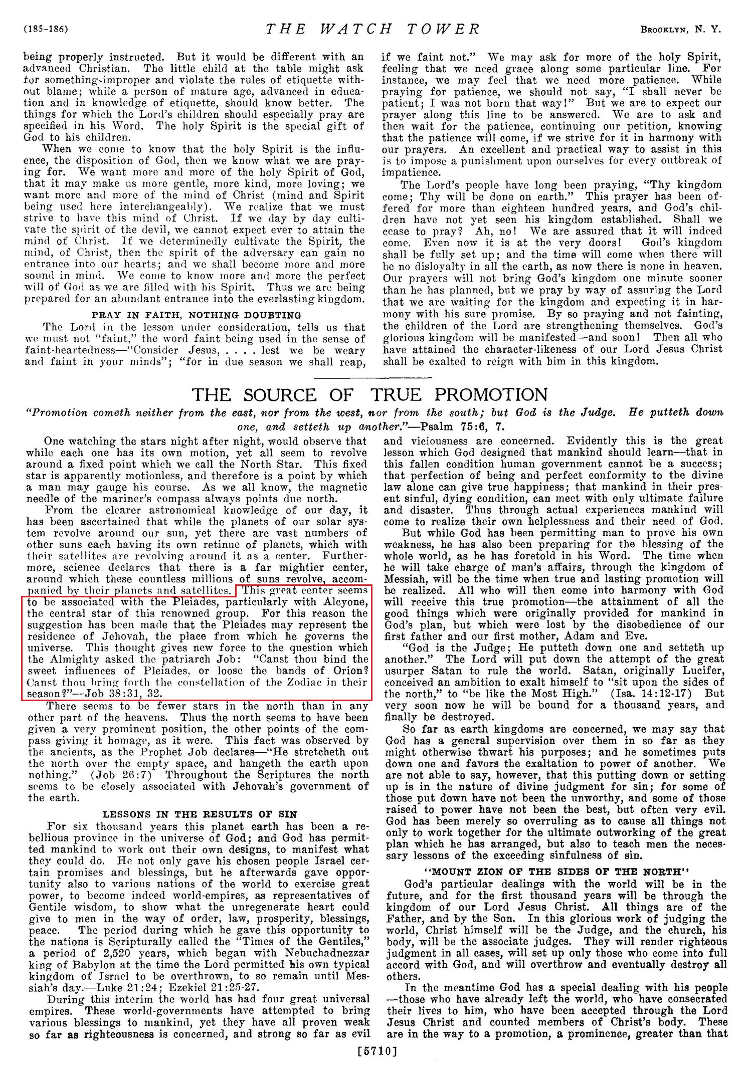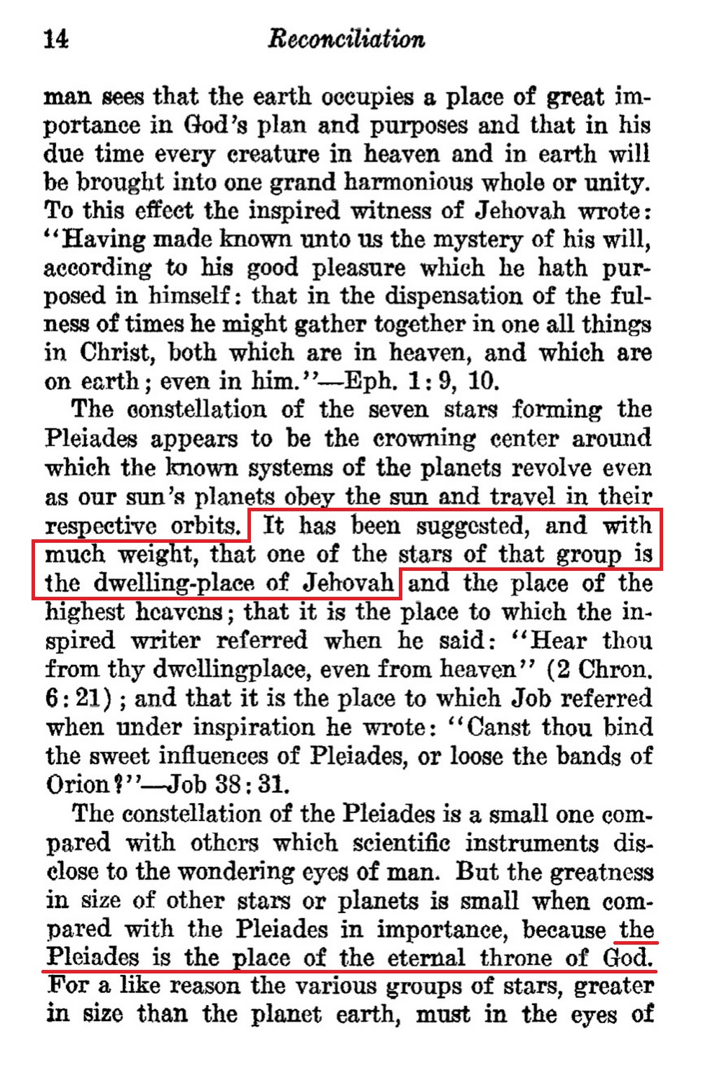 "The constellation of the seven stars forming the Pleides appears to be the crowning center around which the known systems of the planets revolve even as our sun's planets obey the sun and travel in their respective orbits. It has been suggested, and with much weight, that one of the stars of that group is the dwelling-place of Jehovah and the place of the highest heavens; that it is the place to which the inspired writer referred when he said: "Hear thou from thy dwelling place, even from heaven" (2 Chron. 6:21); and that it is the place to which Job referred when under inspiration he wrote: "Canst thou bind the sweet influences of Pleiades, or loose the bands of Orion?"--Job 38:31.