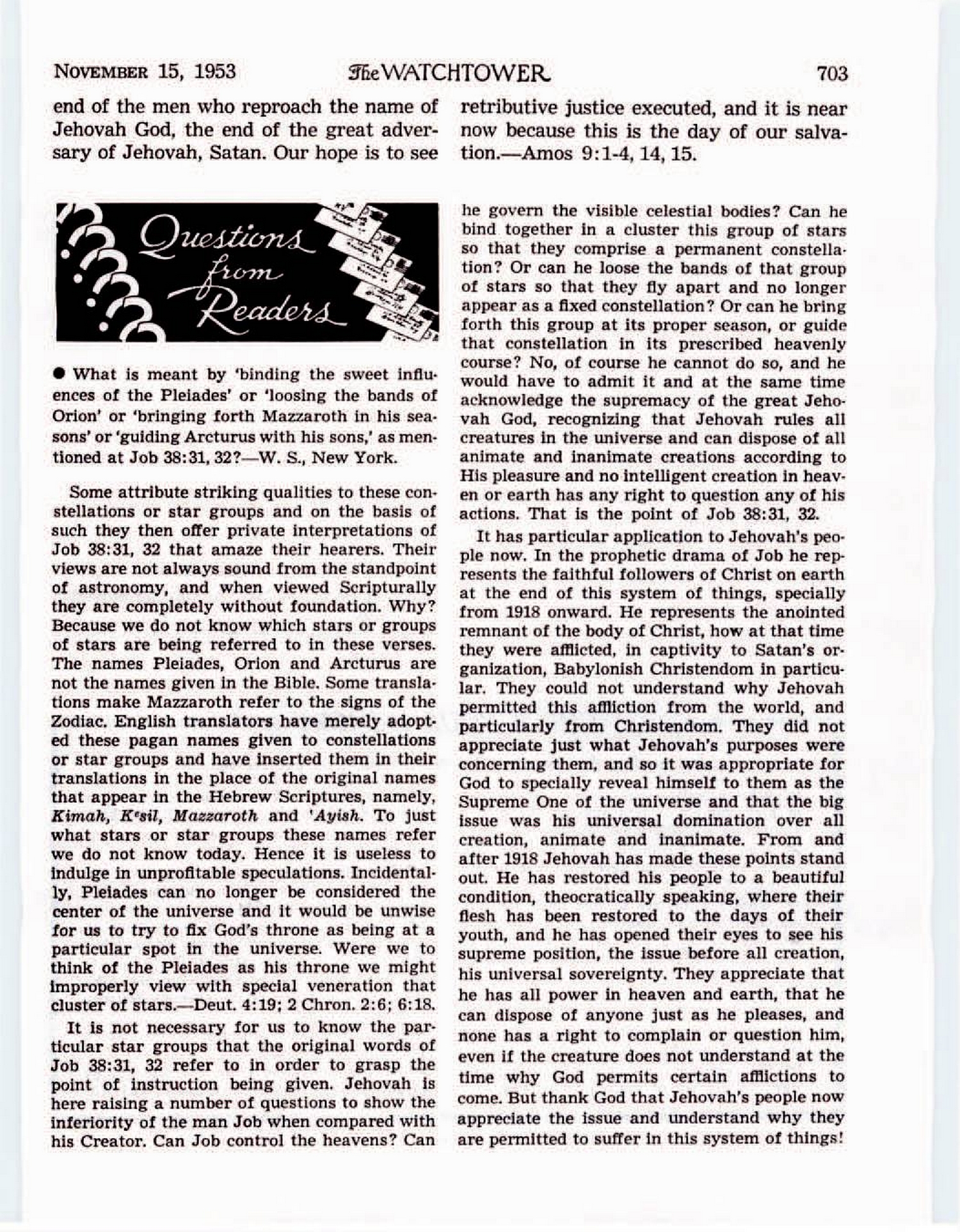 • What is meant by 'binding the sweet influences of the Pleiades' or 'loosing the bands of Orion' or 'bringing forth Mazzaroth in his seasons' or 'guiding Arcturus with his sons,' as mentioned at Job 38:31, 32?-W. S., New York. Some attribute striking qualities to these constellations or star groups and on the basis of such they then offer private interpretations of Job 38:31, 32 that amaze their hearers. Their views are not always sound from the standpoint of astronomy, and when viewed Scripturally they are completely without foundation. Why? Because we do not know which stars or groups of stars are being referred to in these verses. The names Pleiades, Orion and Arcturus are not the names given in the Bible. Some translations make Mazzaroth refer to the signs of the Zodiac. English translators have merely adopted these pagan names given to constellations or star groups and have inserted them in their translations in the place of the original names that appear in the Hebrew Scriptures, namely, Kimah, Kesil, Mazzaroth and 'Ayish. To just what stars or star groups these names refer we do not know today. Hence it is useless to indulge in unprofitable speculations. Incidentally, Pleiades can no longer be considered the center of the universe and it would be unwise for us to try to fix God's throne as being at a particular spot in the universe. Were we to think of the Pleiades as his throne we might improperly view with special veneration that cluster of stars.-Deut. 4:19; 2 Chron. 2:6; 6:18. Source : 🇺🇸 The Watchtower, November 15 1953, page 703 + Cover |