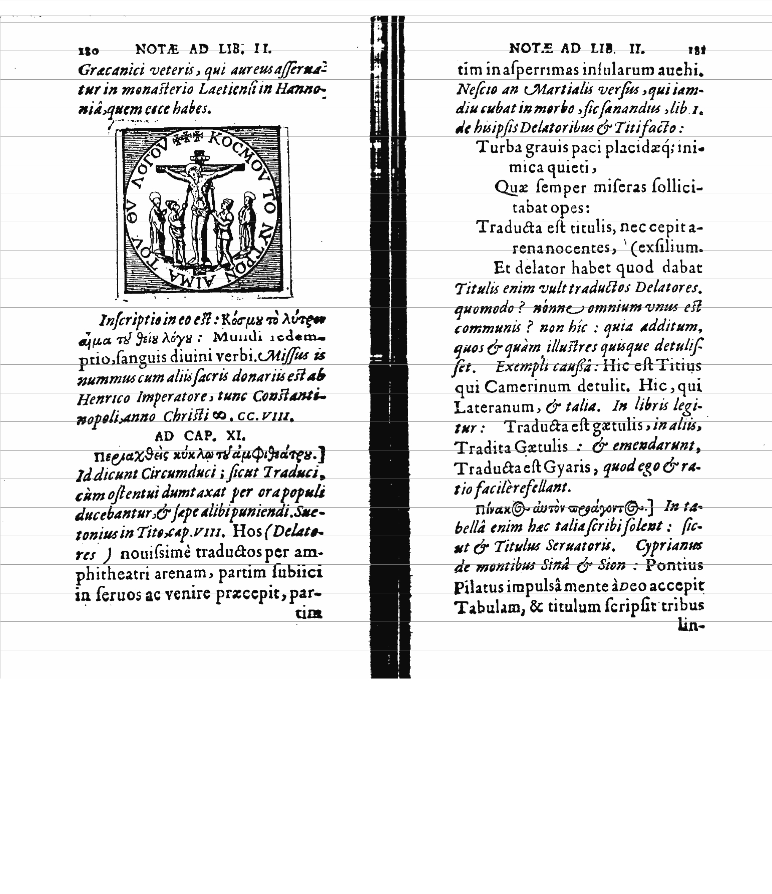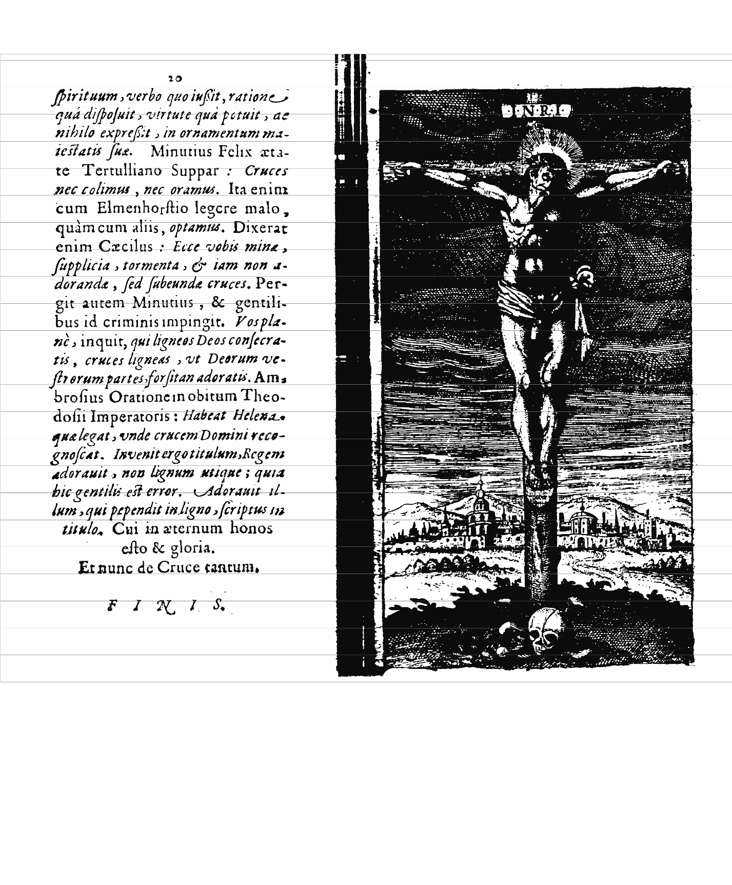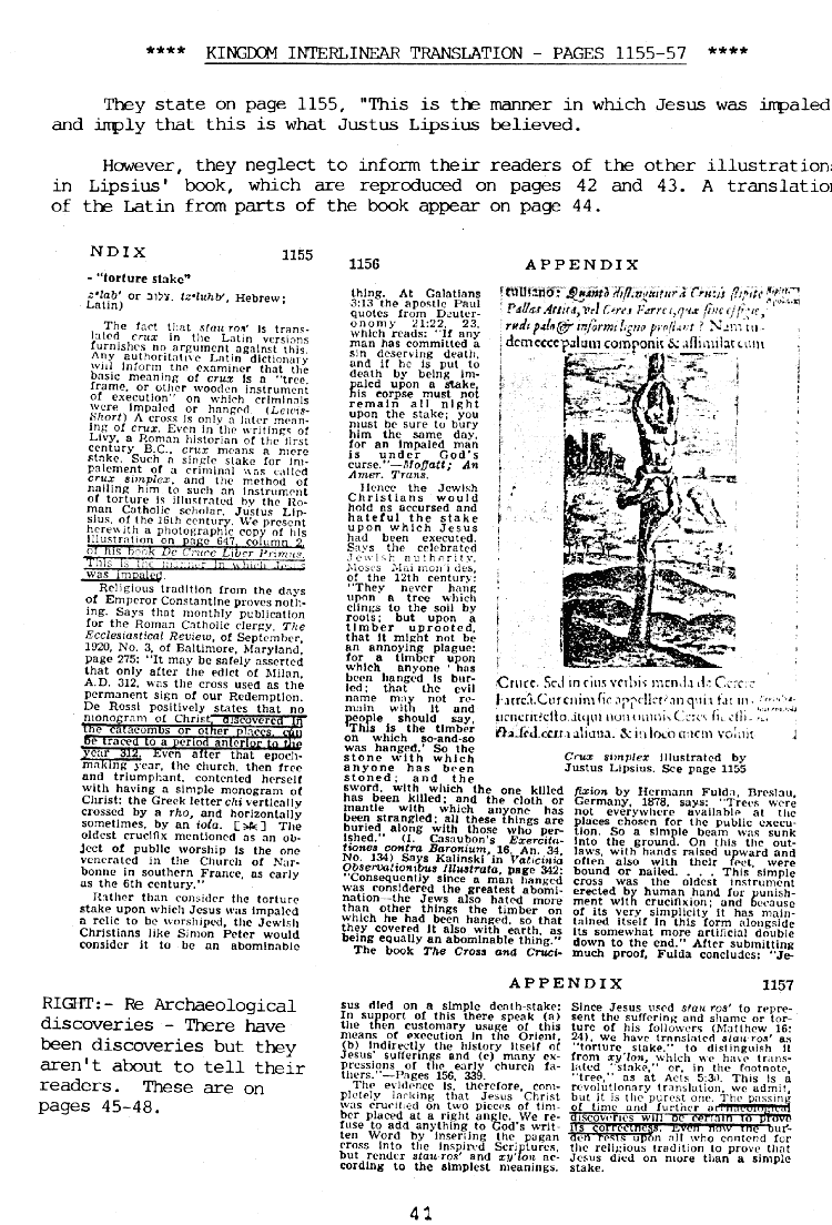 Un journaliste américain a recherché le De Cruce Liber Primus écrit par Justus Lipsius. Quelle ne fut pas sa surprise de découvrir qu'en fait, le passage de la page 647 de ce livre, cité par les Témoins de Jéhovah, n'avait rien à voir avec la mort du Christ. Par contre, à la page 661 du même livre, Lipsius, parlant bien cette fois de ce qui concernait cette mort, affirmait très nettement que le Christ avait été supplicié sur une croix, citant d'ailleurs le passage d'Irénée reproduit ci-dessus ainsi qu'un passage sensiblement identique de Tertullien, qu'il illustre par une gravure montrant Jésus sur la croix…