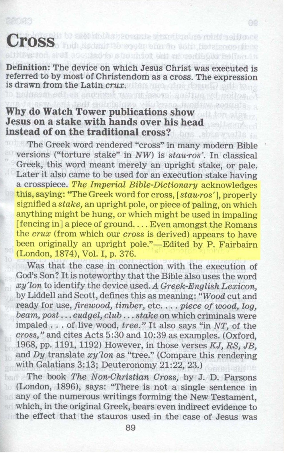 3) Enfin, argument « massue », les Témoins de Jéhovah citent un certain J. Parsons, auteur du XIXe siècle, sans d'ailleurs, comme ils en ont l'habitude, nous dire qui est cet homme et en quoi ses déclarations font autorité. Ce serait bien la moindre des choses quand on vient dire, en 1896, le contraire de ce qui a été dit pendant plus de 1860 ans. Donc cet illustre inconnu, qu'on préférerait lire dans le contexte — ce qui, on verra pourquoi par ailleurs, est une sage précaution en présence des citations des Témoins de Jéhovah — dit en substance que rien ne prouve que le mot « stauros » doit être traduit par « croix » et que les conducteurs religieux nous trompent en le traduisant ainsi. On verra plus loin le crédit qu'il convient d'apporter à de pareilles affirmations.