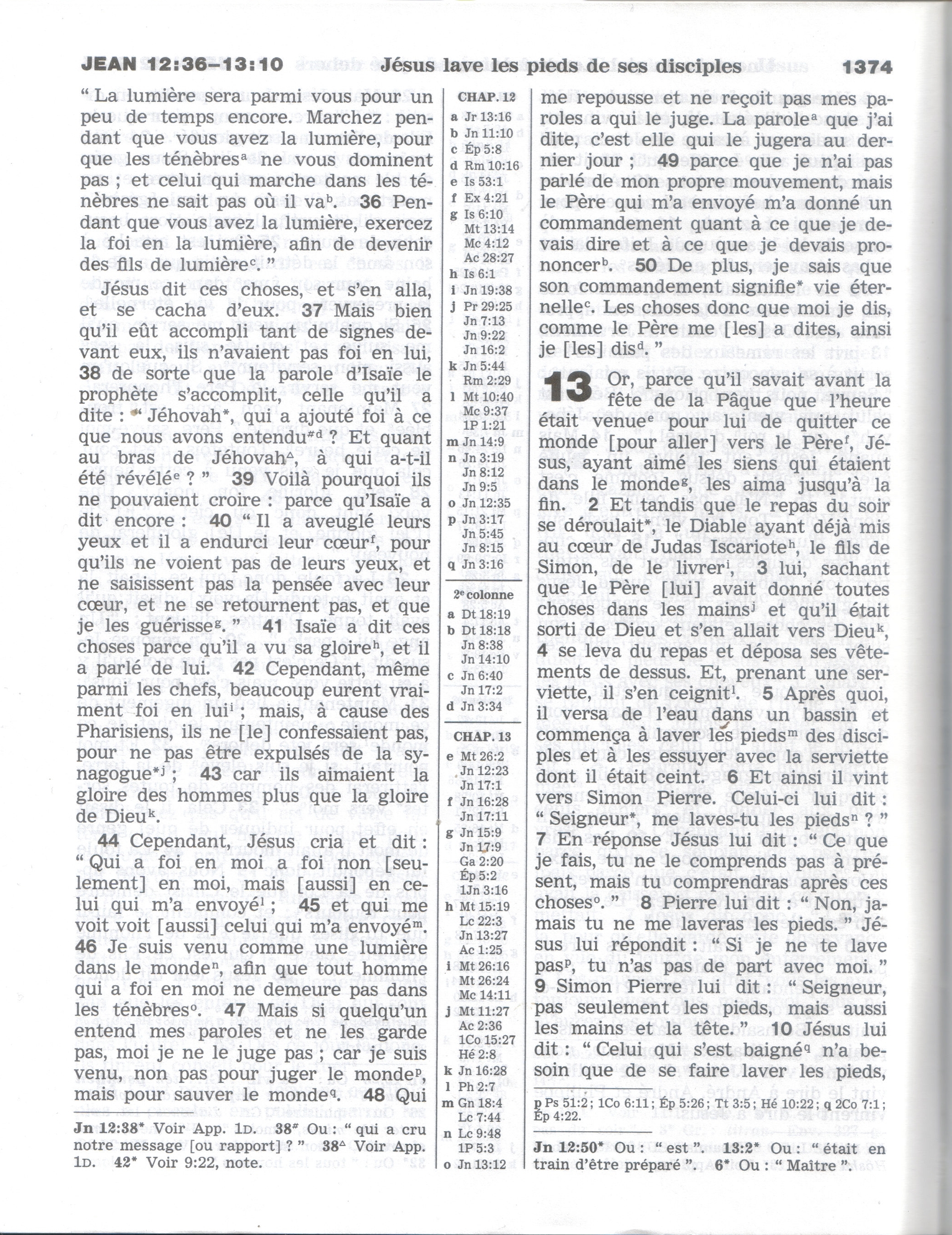 Jésus dit ces choses, et s’en alla, et se cacha d’eux. 37 Mais bien qu’il eût accompli tant de signes devant eux, ils n’avaient pas foi en lui, 38 de sorte que la parole d’Isaïe le prophète s’accomplit, celle qu’il a dite : “ Jéhovah, qui a ajouté foi à ce que nous avons entendu ? Et quant au bras de Jéhovah, à qui a-t-il été révélé ? ” 39 Voilà pourquoi ils ne pouvaient croire : parce qu’Isaïe a dit encore : 40 “ Il a aveuglé leurs yeux et il a endurci leur cœur, pour qu’ils ne voient pas de leurs yeux, et ne saisissent pas la pensée avec leur cœur, et ne se retournent pas, et que je les guérisse. ” 41 Isaïe a dit ces choses parce qu’il a vu sa gloire, et il a parlé de lui.