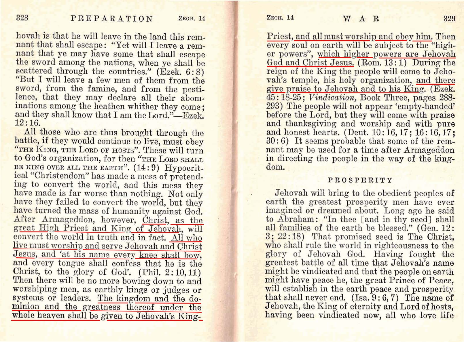 " Tous ceux qui vivent doivent adorer et servir Jéhovah et Christ Jésus , et «à son nom, chaque genou doit s'incliner (...). Toutes les familles de la terre qui obéissent avec joie viennent à Jérusalem pour adorer Christ et Jéhovah "