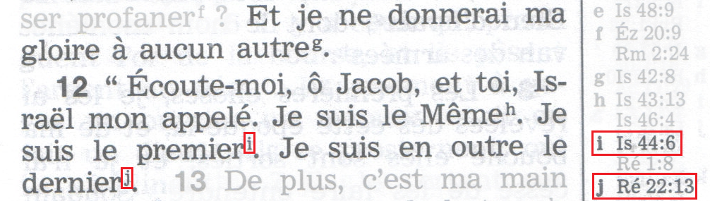 1) Le 1er renvoi au-dessus du mot « premier », nous conduit à Isaïe 44:6, où il est encore question de celui qui est appelé « le premier et le dernier » :