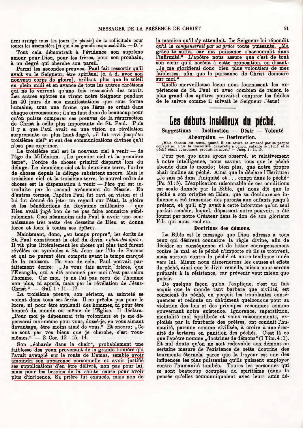 Paul fait ressortir qu'il avait vu le Seigneur, être spirituel [c. à d. avec son nouveau corps de gloire], brillant plus que le soleil en plein midi... Son "écharde dans la chair", probablement une faiblesse des yeux provenant de la grande lumière qui l'avait aveuglé sur la route de Damas, semble avoir amoindri son apparence personnelle et avoir justifié ses supplications d'en être délivré, non pas pour lui, mais pour les besoins de la sainte cause pour avoir plus d'influence. Sa prière fut exaucée, mais non de la manière qu'il s'y attendait. Le Seigneur lui répondit qu'il le compenserait par sa grâce toute puissante. "Ma grâce te suffit, car ma puissance s'accomplit dans l'infirmité". L'apôtre nous assure que c'est de tout son coeur qu'il accéda à cette proposition, en disant: "Je me glorifierai donc bien plus volontiers de mes faiblesses, afin que la puissance de Christ demeure sur moi".