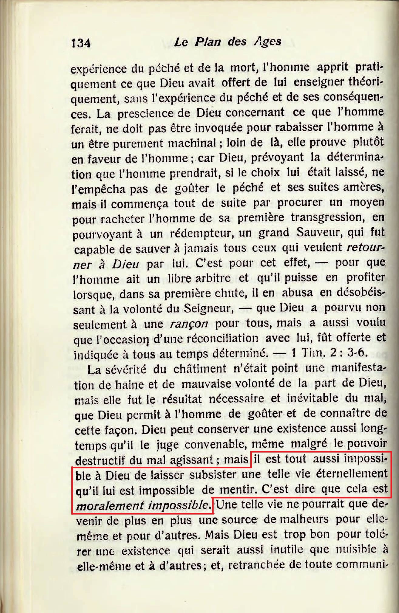 « il est tout aussi impossible à Dieu de laisser subsister une telle vie éternellement qu'il lui est impossible de mentir. C'est dire que cela est moralement impossible. [...] Plusieurs sont ancrés dans l'idée erronée que Dieu a placé notre race à l'épreuve pour la vie avec l'alternative de tourments éternels , tandis qu'il n'est fait aucune allusion de ce genre dans la menace de la punition [...] Les tourments éternels ne sont mentionnés nulle part dans l'Ancien Testament ; on les a déduit d'une façon spécieuse, de quelques rares expressions du Nouveau Testament, qui se trouvent soit parmi les représentations symboliques de l'Apocalypse, soit parmi les paraboles et les discours obscurs de notre Seigneur, qui ne furent point compris par le peuple qui les entendaient (Luc 8:10) et qui, apparemment, ne sont guère mieux compris aujourd'hui. »