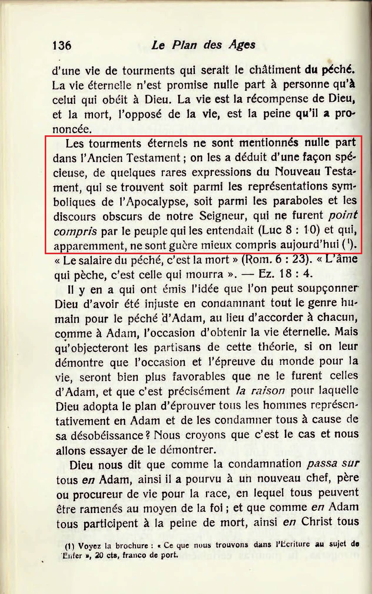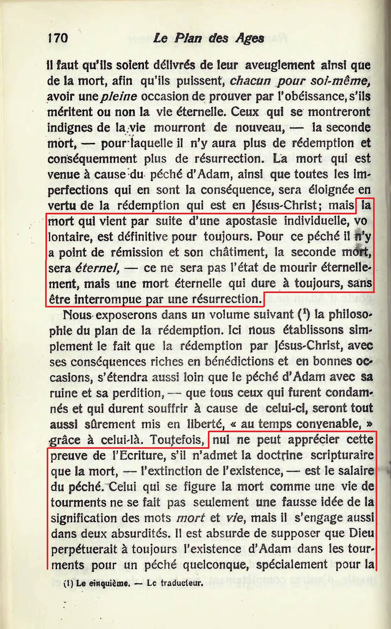 « [...] la mort qui vient par suite d'une apostasie individuelle, volontaire, est définitive pour toujours. Pour ce ce péché il n'y a point de rémission et son châtiment, la seconde mort, sera éternel, - ce ne sera pas l'état de mourir éternellement , mais une mort éternelle qui dure à toujours, sans être interrompue par une résurrection. [...] nul ne peut apprécier cette preuve de l'Ecriture, s'il n'admet la doctrine scripturaire que la mort - l'extinction de l'existence , - est le salaire du péché. Celui qui se figure la mort comme une vie de tourments ne se fait pas seulement une fausse idée de la signification des mots mort et vie , mais il s'engage aussi dans deux absurdités. Il est absurde de supposer que Dieu perpétuerait à toujours l'existence d'Adam dans les tourments pour un péché quelconque , spécialement pour la petite offense d'avoir mangé du fruit défendu. [...] Mais chose étrange, quoique plusieurs s'aperçoivent du désaccord et de l'incompatibilité de la théorie des tourments éternels avec la doctrine des Ecritures : "l'Eternel fit venir sur lui l'iniquité de nous tous", "que Christ mourut pour nos péchés," et qu'ils se voient obligés de renoncer à l'une ou à l'autre par leur inconséquences, ils sont cependant si épris de l'idée des tourments éternels - comme d'une délicatesse spirituelle - qu'ils s'y attachent en dépit des déclarations contraires des Ecritures, et nient, par conséquent, de propos délibéré, que Jésus paya le prix de la rançon pour tout le monde, bien que cette vérité soit enseignée à chaque feuillet de la Bible. »