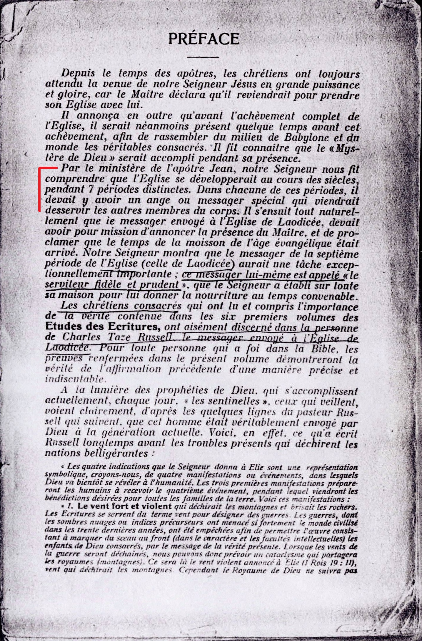 « Through St John the Lord Jesus revealed the fact that the Church would be developed during seven distinct periods, or epochs ; and that for each of these epochs He would have a special angel, or messenger , to serve the other members of the Body. It follows, then, that the messenger to the last, or Laodicean , epoch would declare the Presence of the Lord and the time of the Harvest of the Gospel Age. The great Master laid special emphasis on the Importance of the messenger to the seventh, or Laodicean , period of the Church, saying that such an one would be "a faithful and wise servant, whom his Lord would make ruler over all His Household, to give them meat In due season." Those consecrated Christians who have read and fully appreciated the Truth as contained In the preceding six volumes of STUDIES IN THE SCRIPTURES readily see and agree that Charles Taze Russell was the messenger of the Church of Laodicea. In the mind of every one who believes the Bible the evidence set forth In this volume will establish that fact beyond the question of a doubt. In the light of Divine Prophecy, now being dally fulfilled and made clear to "the watchers," the following from the pen of Pastor Russell is further proof that he was sent of God to this generation. »