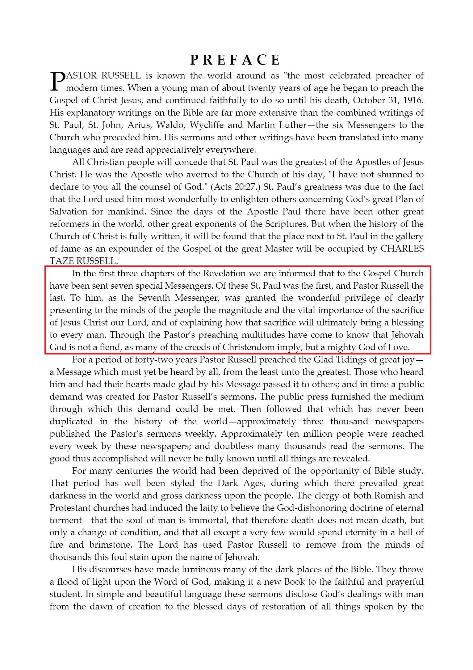 « In the first three chapters of the Revelation we are informed that to the Gospel Church have been sent seven special Messengers. Of these St. Paul was the first, and Pastor Russell the last. To him, as the Seventh Messenger , was granted the wonderful privilege of clearly presenting to the minds of the people the magnitude and the vital importance of the sacrifice of Jesus Christ our Lord, and of explaining how that sacrifice will ultimately bring a blessing to every man. Through the Pastor’s preaching multitudes have come to know that Jehovah God is not a fiend, as many of the creeds of Christendom imply, but a mighty God of Love. »