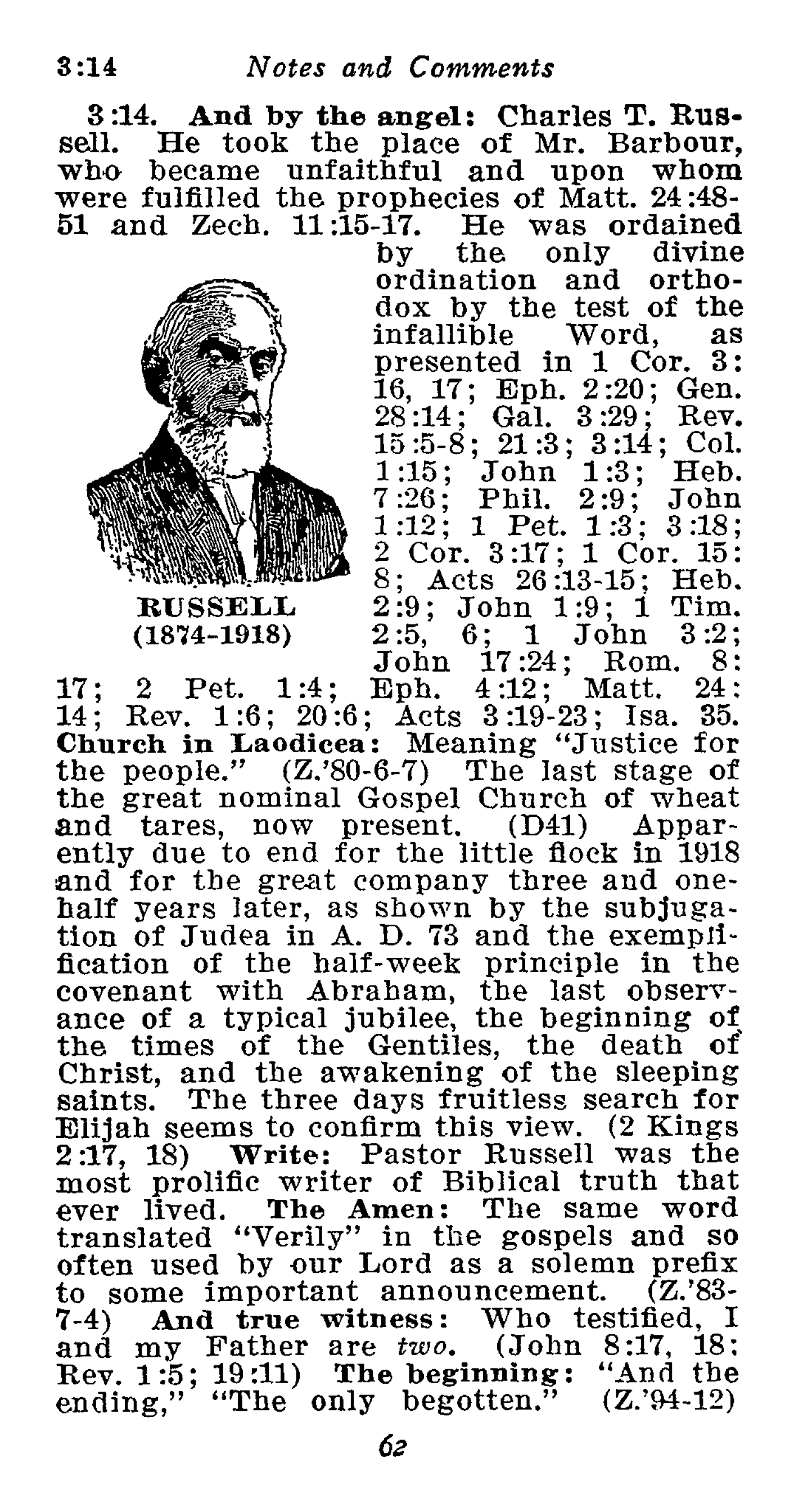 « 3:14. And by the angel: Charles T. Russell. He took the place of Mr. Barbour, who became unfaithful and upon whom were fulfilled the prophecies of Matt. 24:48-51 and Zech. 11:15-17. He was ordained by the only divine ordination and orthodox by the test of the infallible Word, [...]